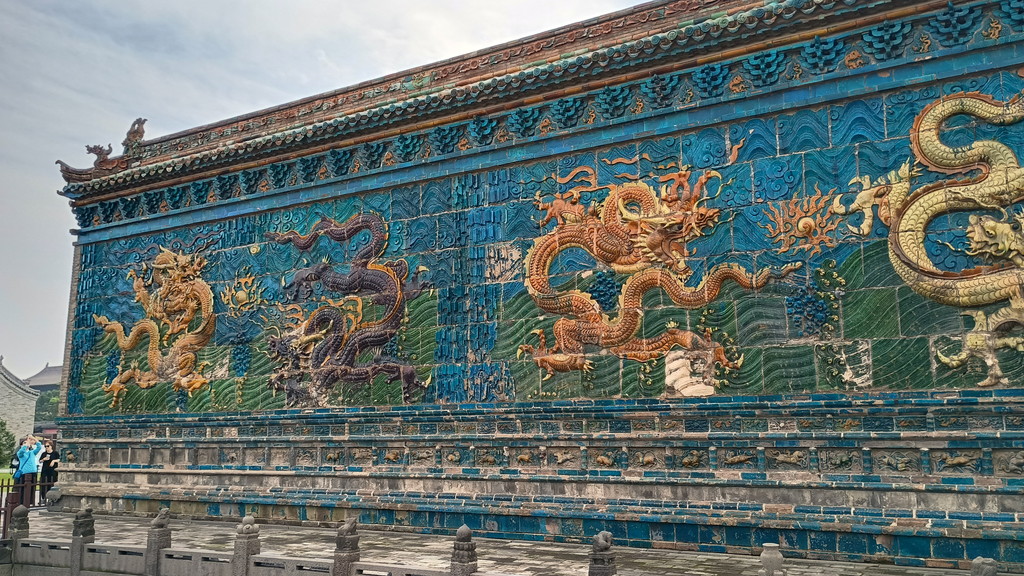 龍壁全体の長さは45.5m、高さ8m、厚さは2mで、壁座、壁体、壁頂の3つから構成されます。壁座は須弥壇で、束腰の部分に獅子、虎、象、唐獅子、麒麟、天馬等の動物が彫られています。正面の壁には雲海に聳え立つ九頭の巨大な龍が彫刻されており、壁全体は黄、緑、白、朱、紫、藍色の彩色琉璃瓦426枚が敷き詰められています。壁頂は木造建築を模倣した寄棟屋根となっており、主棟には龍や蓮華などの彫刻が施されています。