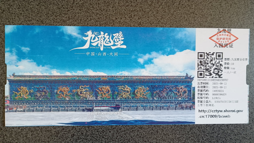 九龍壁は、明の太祖洪武帝の時代、1392年に太祖の13番目の息子「朱桂」の邸宅前に建立された影壁(照壁)です。600年以上の歴史を誇ります。中国に現存する九龍壁は3つあり、大同のほかには北京の故宮博物館と北海公園にあります。先ほど見た「代王府」が朱桂の邸宅となります。歴史上、山西省に「代」という国号を持つ国が存在したことがあり、「代」という王号はこれに由来していると思います。