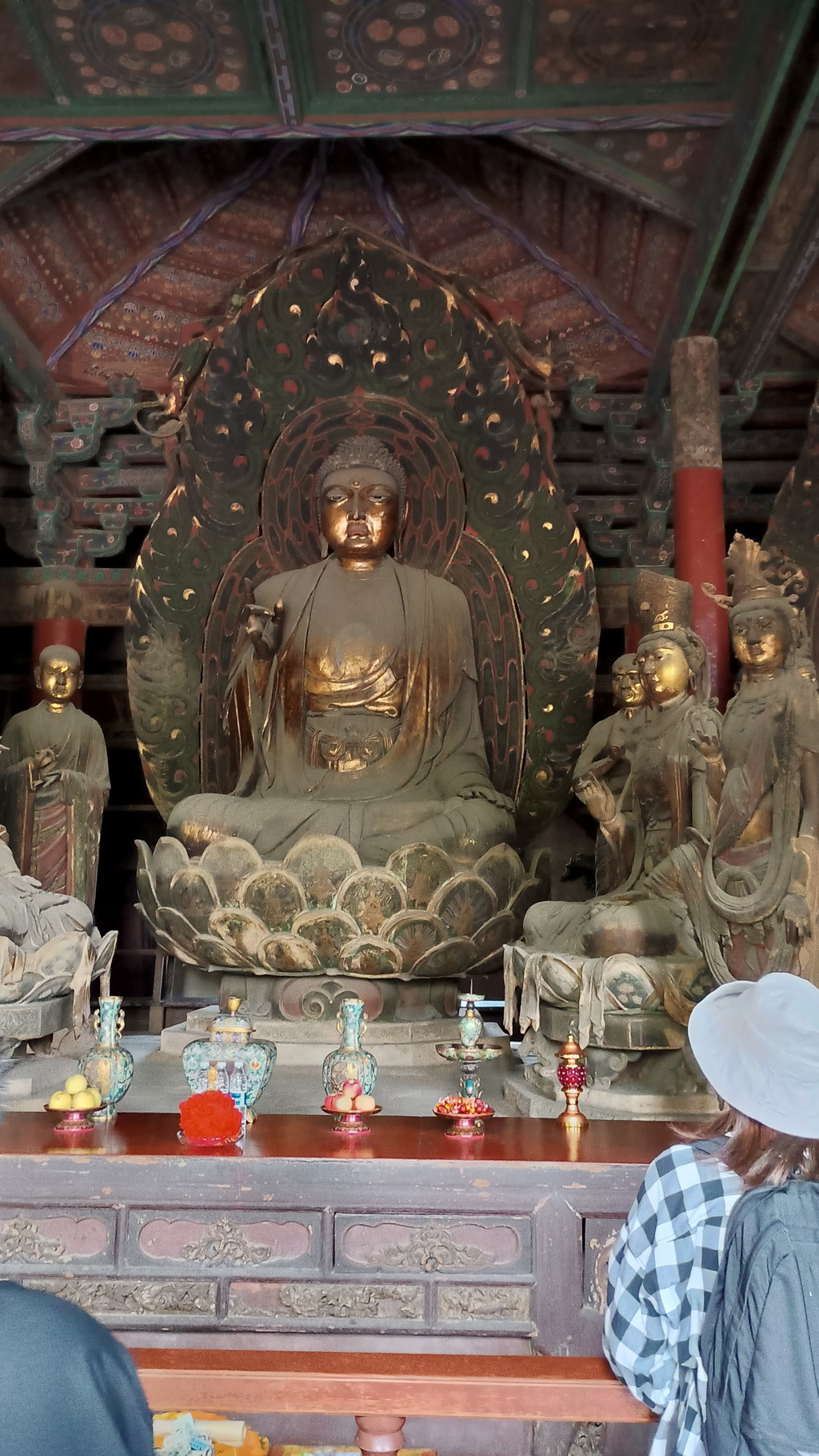 薄伽教藏殿には31体の彩色菩薩像が安置されています。「東洋のヴィーナス」と呼ばれる有名な塑像があったようですが、この時は認識していません。後から写真を確認したところ、たまたま撮影できていました。下記2番目の写真(横長)の右側で手を合わせている像らしいです。