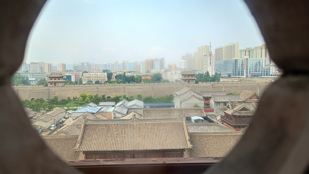 車内は、観光客と地元のお客さんが半々といったところです。バスターミナルから出ると、外は土砂降りで、激しい横風が吹きつけてきます。バスから降りてもこの雨が弱まっていなかったらどうしようかと不安になります。大同市は300万人に近い人口がある都会なので、大同南駅周辺は発展しており、高層ビルやマンションが立ち並んでいます。他の都市と同様に、道路は車線が多く整然としており、大規模な都市計画に従って開発が進んだように見受けられました。途中、「御河」と呼ばれる大きな河川を渡って間もなくすると、大同古城が見えてきました。古城の外にあるホテルを利用するお客さんも多いようで、古城に入るまでに大半の乗客が降りました。