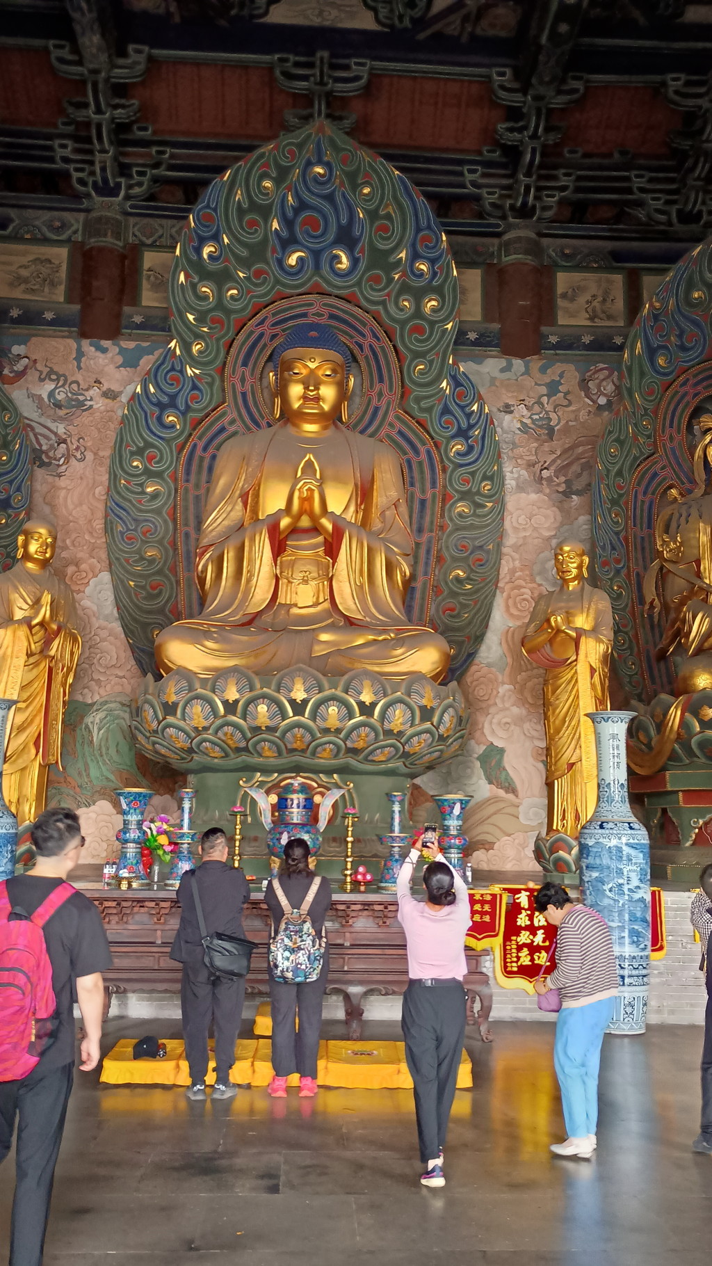 「普光明殿」は、毘盧遮那仏の音訳「光明普照」に由来し、これは「宇宙を照らす仏陀の光」という意味を持ちます。内部には、中央に「毘盧遮那仏(毗卢遮那佛)」、左に「文殊菩薩(菩萨)」、右に「普賢菩薩(菩萨)」の華厳経三聖像(华严三圣像)が安置されています。