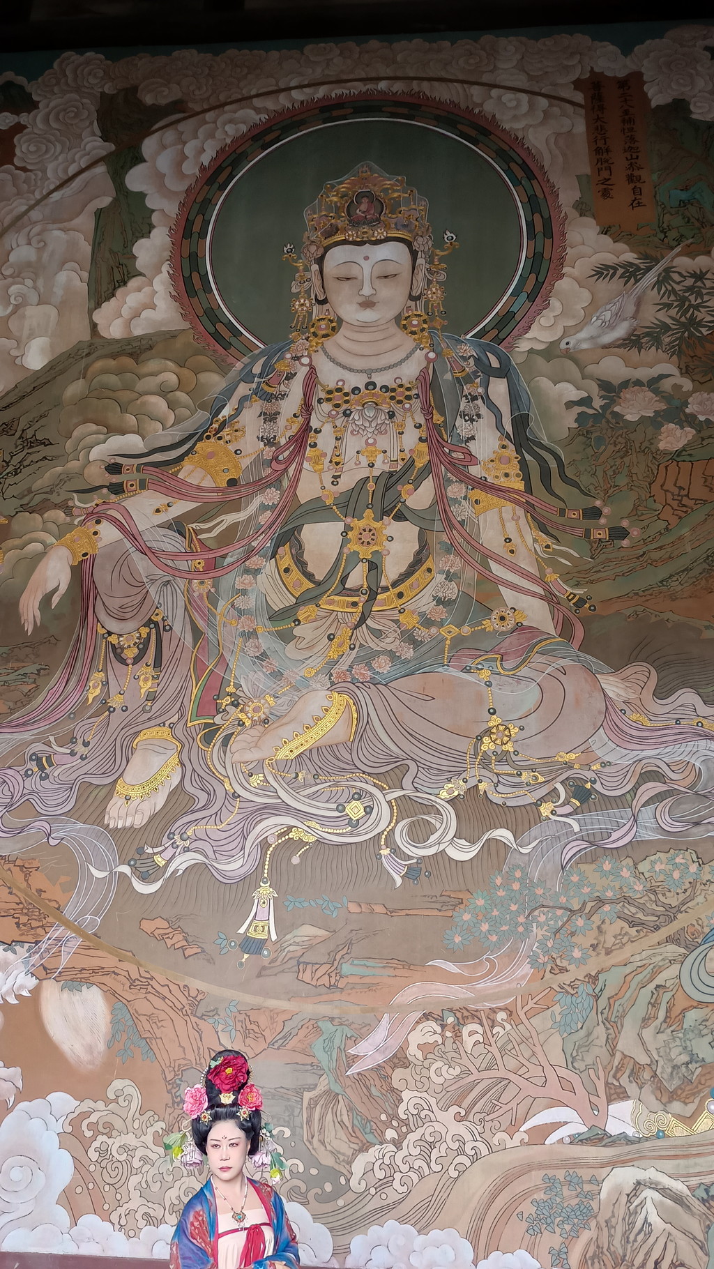 周囲には見事な壁画が描かれていましたが、こちらは「《善财童子五十三参》」という物語を描いているそうです。周りには漢服に身を包んだ若い女性が何人もいて、各々写真撮影に没頭していました。