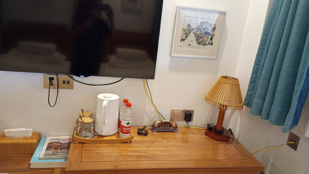 部屋は非常に広く、統一感のある木造ベースの内装は落ち着きがありました。デスクは広く、作業するには十分なスペースが設けられていました。アメニティは充実しており、大同の観光ガイドなどの書籍も置いてありました。設備については、湯沸かしポットがあり、冷蔵庫はありませんでした。