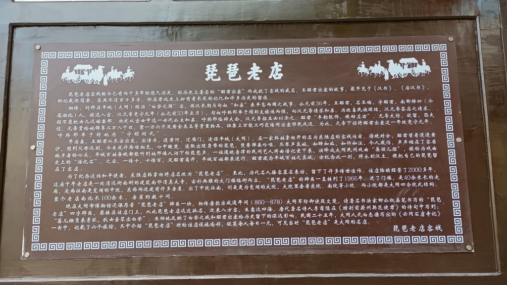 匈奴に嫁ぐことになった王昭君は、平城を通過した際、韓姓の男が営む「東勝店(东胜店)」という名前の客栈(宿)に宿泊しました。王昭君は最後に泊まった漢の宿で、琵琶を演奏し、祖国に別れを告げました。彼女が奏でる琵琶の音は、嘆きと悲しみに満ちており、多くの人々の心に深く響いたそうです。宿の主人は、この平和の使者を偲んで、店名を「琵琶老店」と改めました。以来、この宿には多くの署名人や詩人が訪れ、名作の数々を残しました。