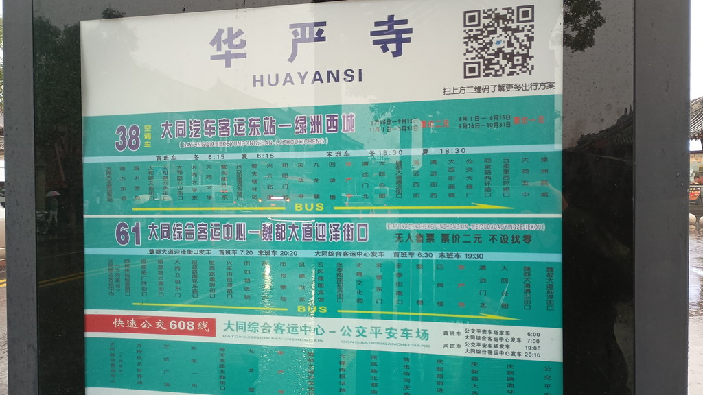 9時過ぎに旅館を出たのですが、かつて見たことがないような激しい雨が降り始めていました。空は真っ黒で横風も非常に強く、さすがに危険を感じる状況だったので一旦部屋に戻ります。天気予報を確認すると、この激しい雨は長く続かず、2時間後ぐらいには天候は改善しそうな感じでした。一昨日も同じような状況だったので、この後天候が改善することを期待して、9時半過ぎ、少し雨が弱まったのを確認してから外に出ました。旅館近くのバス停「華厳寺(华严寺)」に向かいます。一応屋根付きのバス停なので、雨宿りしながら38路バスを待ちます。道路は水浸しで、乗用車やバスが水しぶきを上げながら通り過ぎて行きます。通りを挟んだバス停の向かいは、華厳寺の入口になっているのですが、このような悪天候の中でも、次々と大型バスがやってきては団体のツアー客を降ろしている光景がありました。