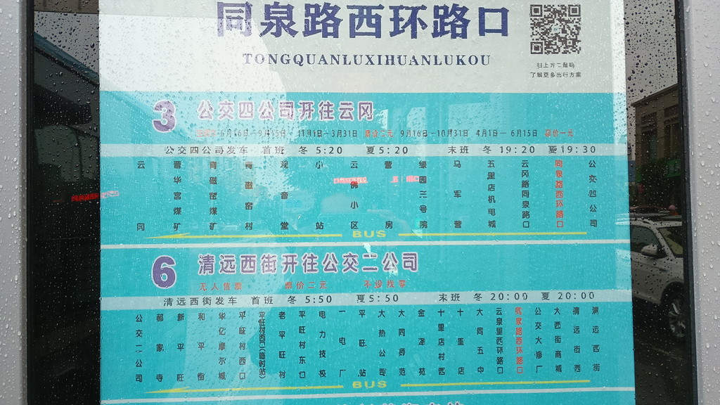 バスは西門(清遠門)の北側にある、車両用の出入口から出て、いくつかの大きな通りを走り、約10分で、古城から約4km西の位置にある、大通り「同泉路」にある「同泉路西环路口」というバス停で降車しました。私以外にも雲崗石窟に向かうお客さんがいたようで、何名かが一緒に降りました。次は、同じバス停から3路バスに乗ります。3路バスも10分ぐらい待っているとやって来ました。料金はこちらも2元(約42円)です。このバスは雲崗石窟(正確には雲崗(云冈))が終点なので、最後まで安心して乗ることができます。