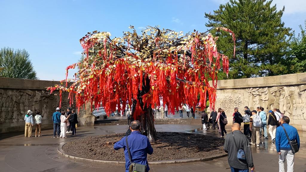 大道の先には、菩提樹が植わっており、周囲を囲むように大きな円形レリーフが配置されています。「帝后礼仏図(帝后礼佛图)」といい、北魏の皇帝と皇后が石窟寺院を訪れ仏を拝む様子が描かれています。