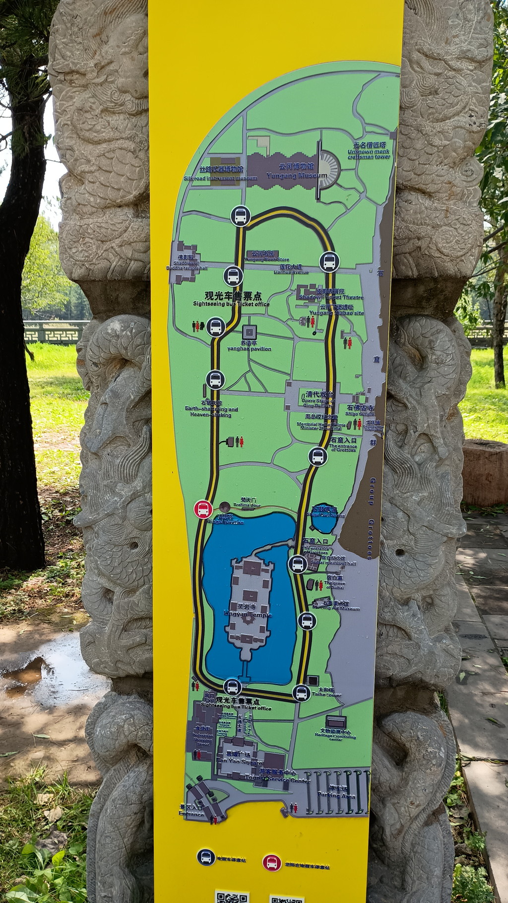 雲崗石窟景区入口前の道路は、駐車場に入るための車両で混雑していましたが、バスは専用車線を通ることができるので、時間のロスがほとんどありませんでした。帰りの3路バスも、同じバス停から乗れば良いことを確認して景区に入ります。