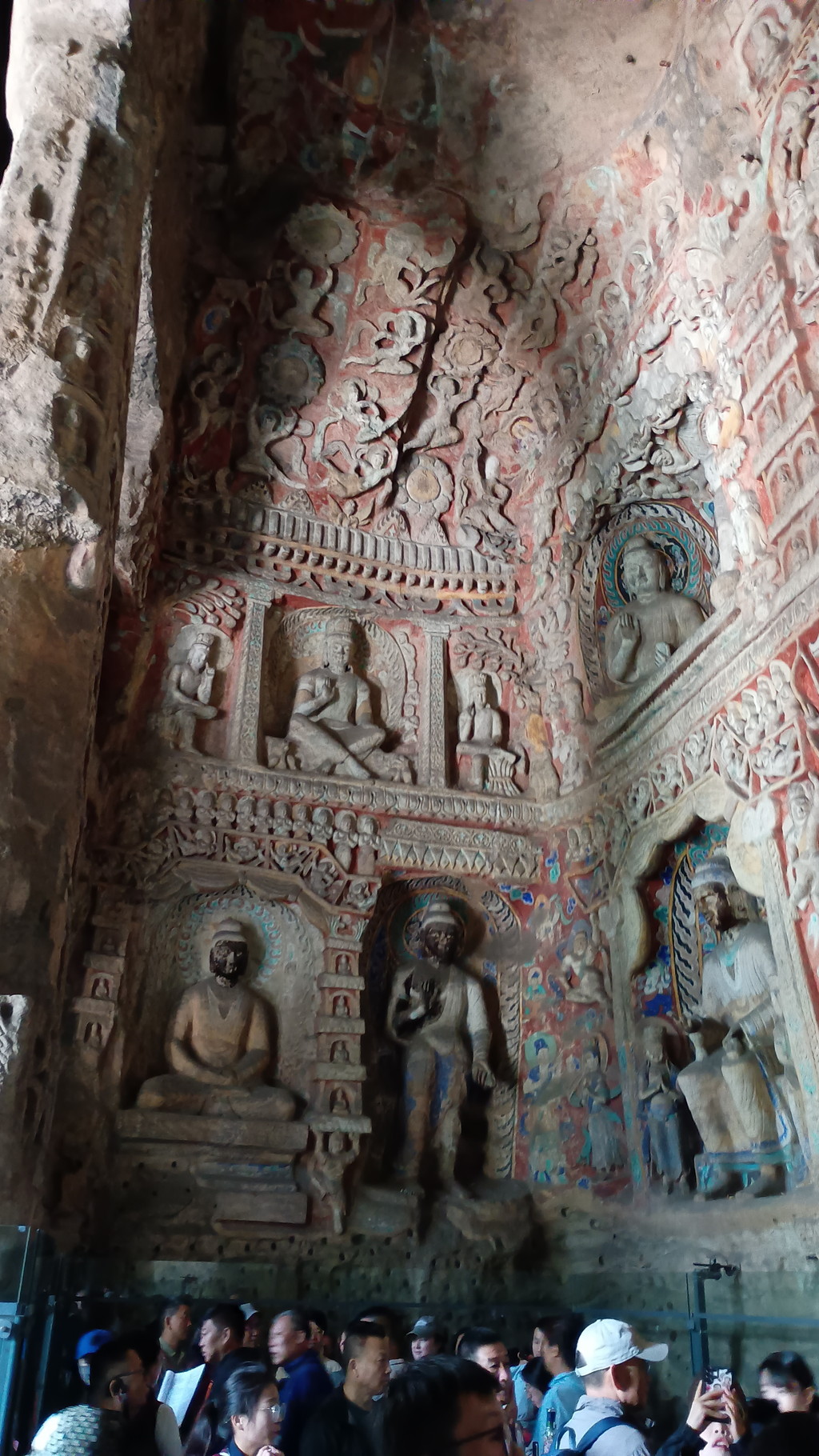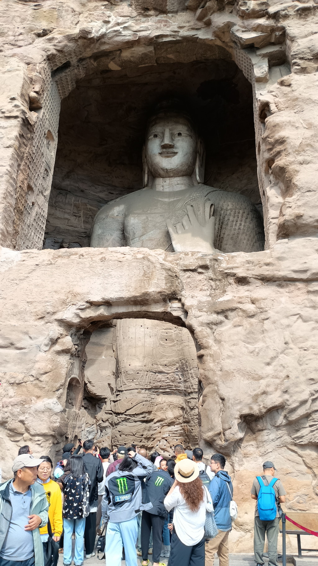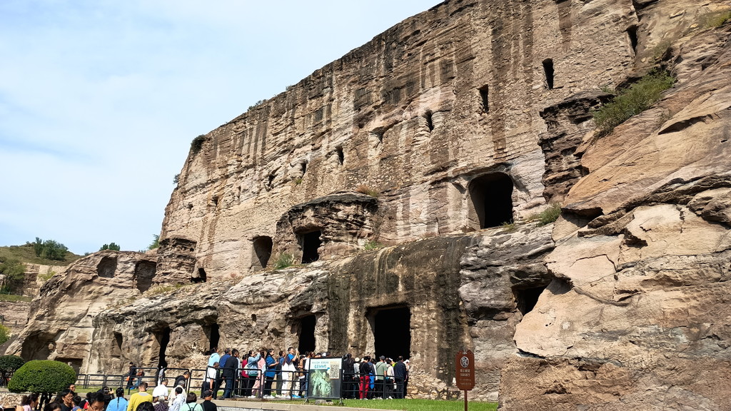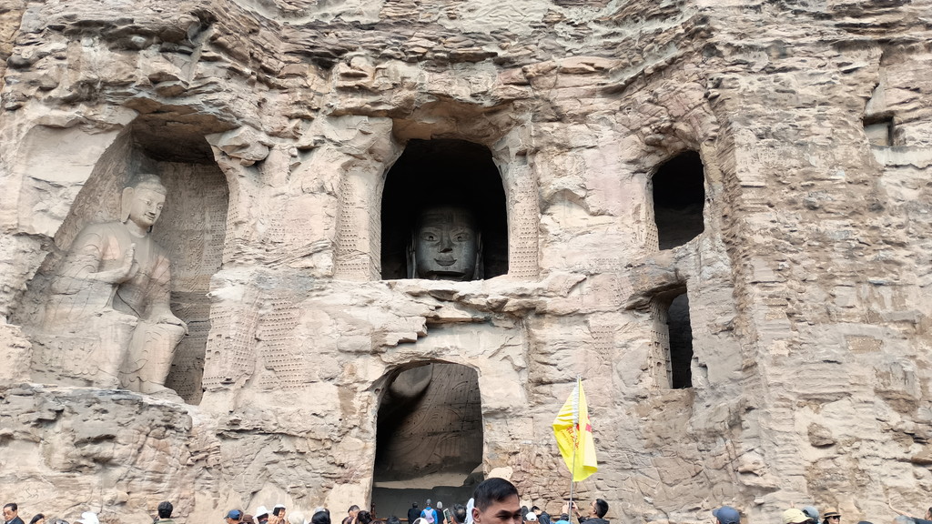 第3窟前は行列が出来ていました。第3窟は雲崗石窟の中でも最大規模で、全長50m、断崖の高さは25mです。外壁上部には細長い穴が見えますが、当時は前面に壮麗な木造建築が築かれていたことを示してます。