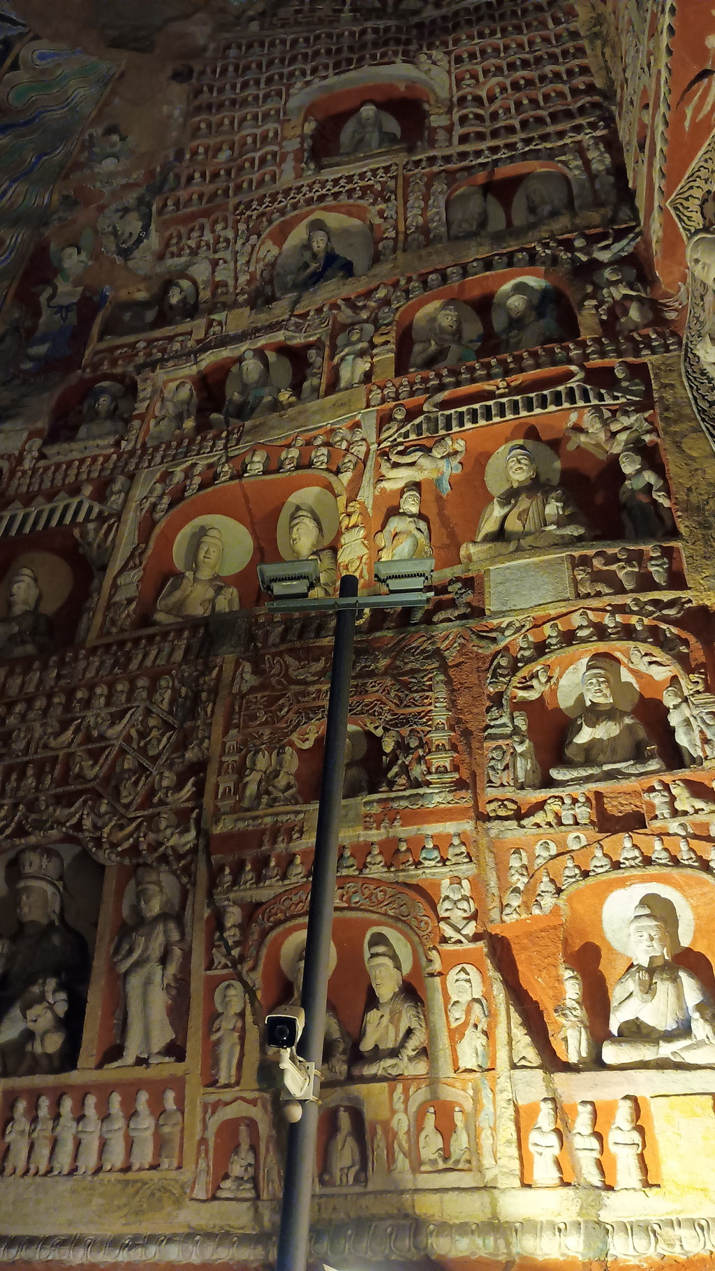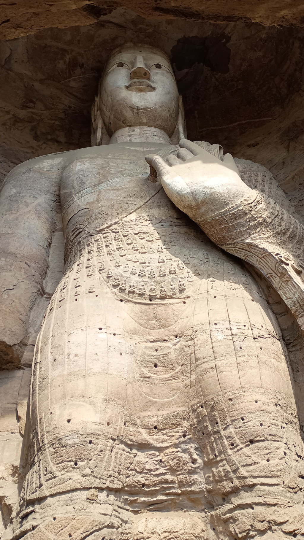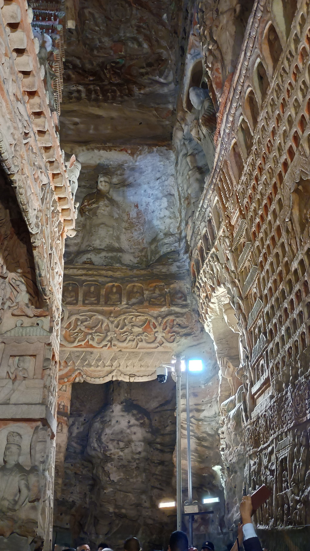 第3窟前は行列が出来ていました。第3窟は雲崗石窟の中でも最大規模で、全長50m、断崖の高さは25mです。外壁上部には細長い穴が見えますが、当時は前面に壮麗な木造建築が築かれていたことを示してます。