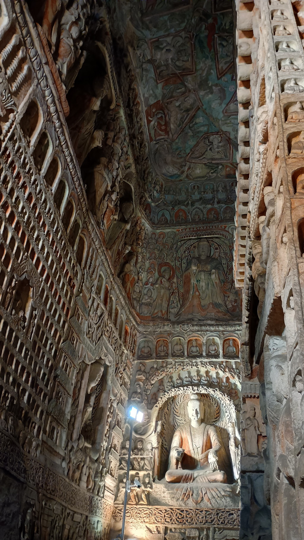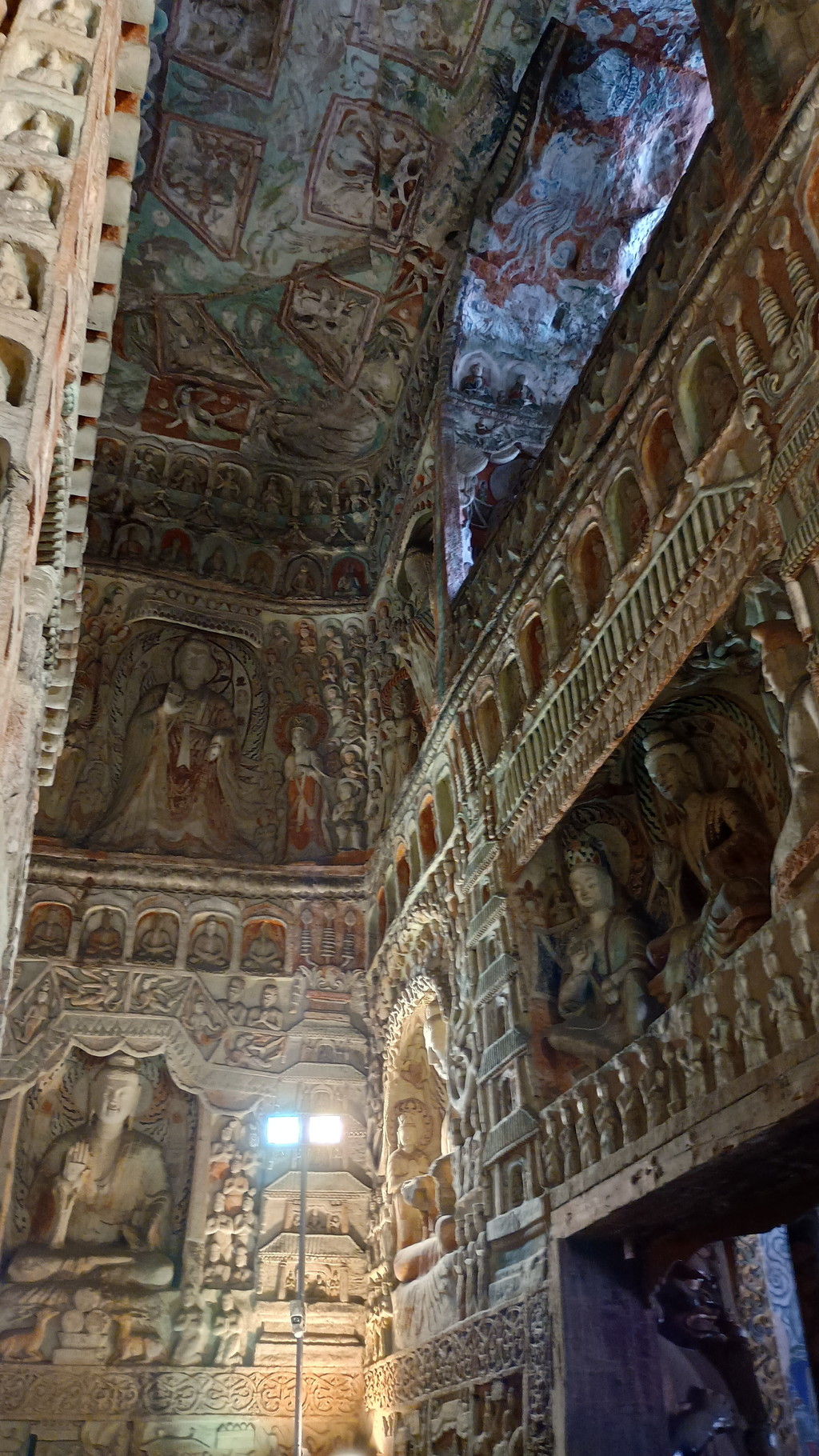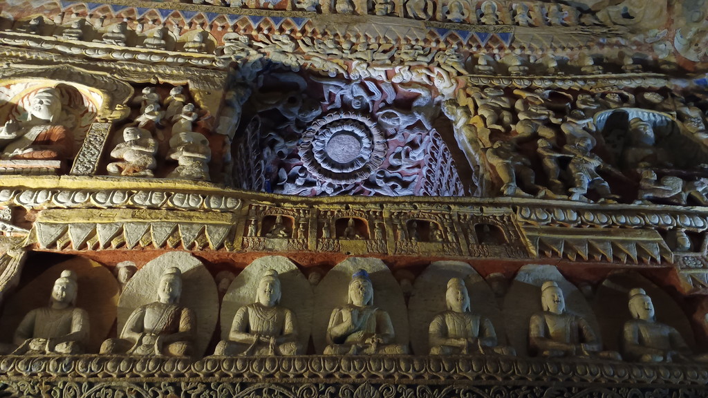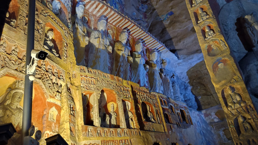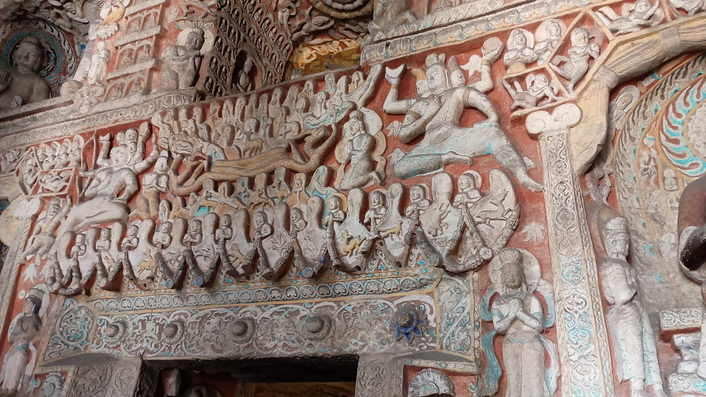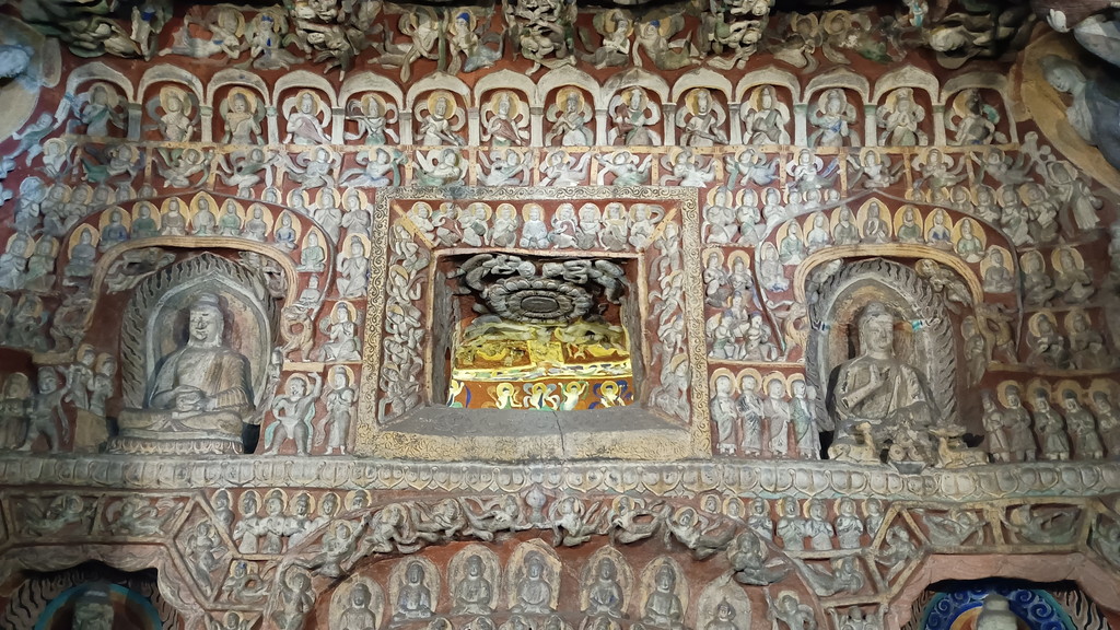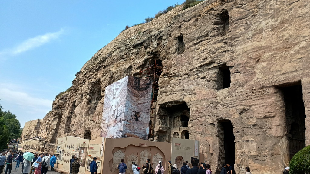 第5窟の中は非公開となっており、第6窟の方が公開されていました。主室はほぼ正方形で、中央には方形の塔柱があります。主室の4面、塔柱には隙間なく精緻を極めた彫刻が施されており、圧巻の光景でした。他の石窟に比べても、質量共にこの石窟は頭1つ抜けており、北魏が絶頂期だった時期に、このような素晴らしい石窟が建立されたのは決して偶然ではなく、国そのものの溢れんばかりの活力が仏教芸術に注ぎ込まれた結果なのだと感じました。