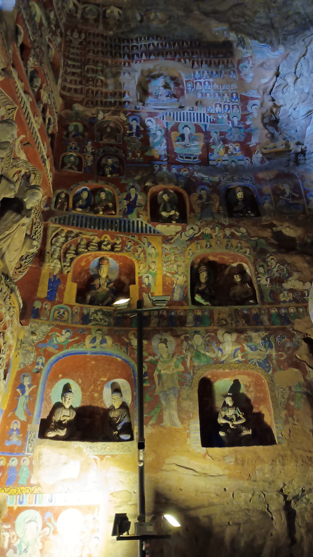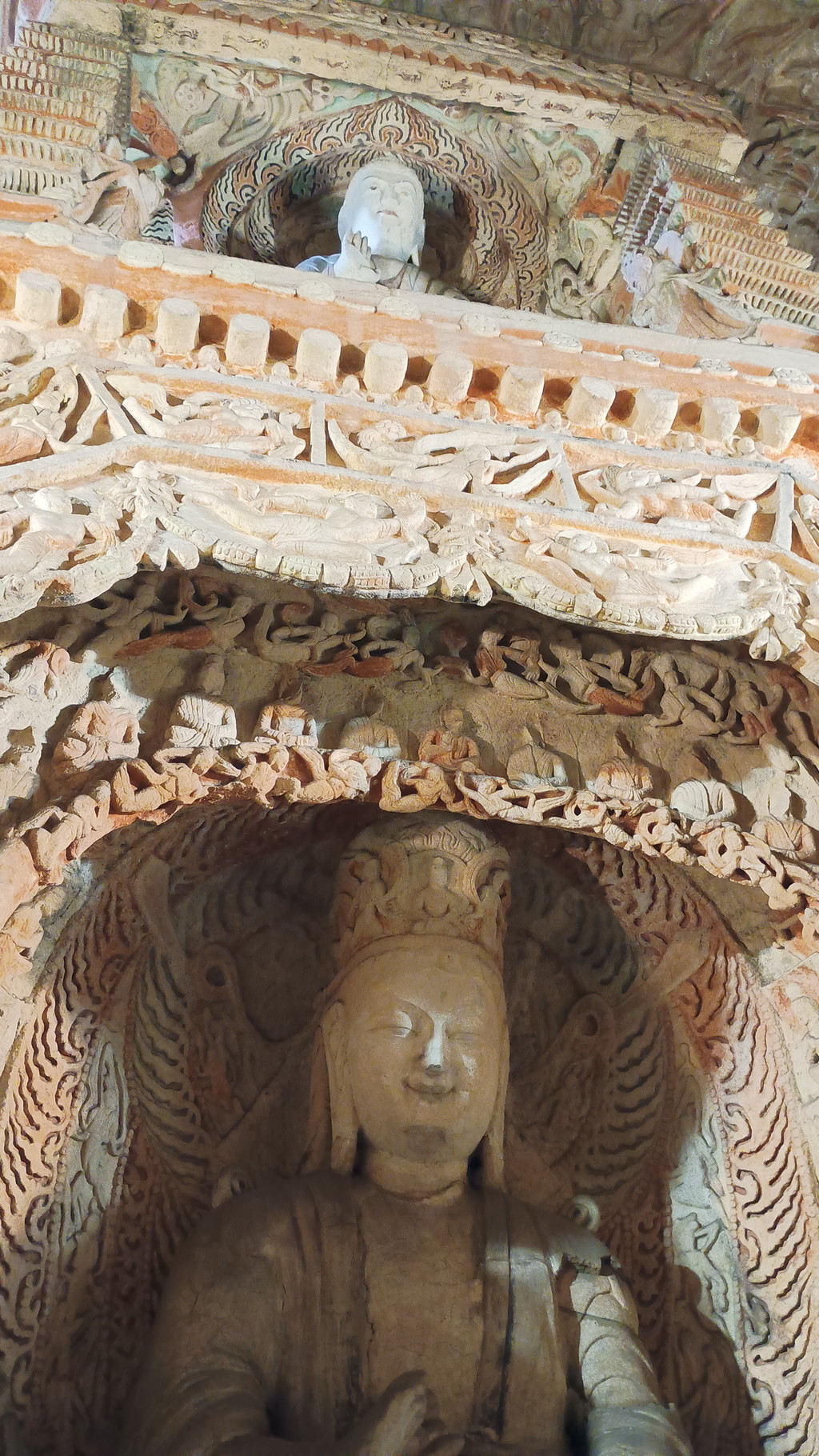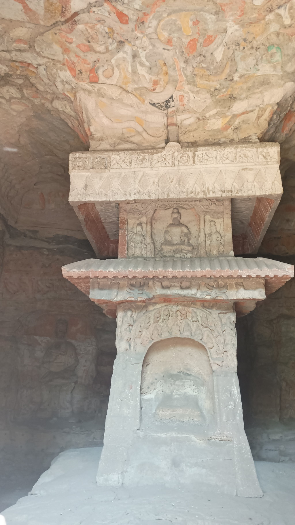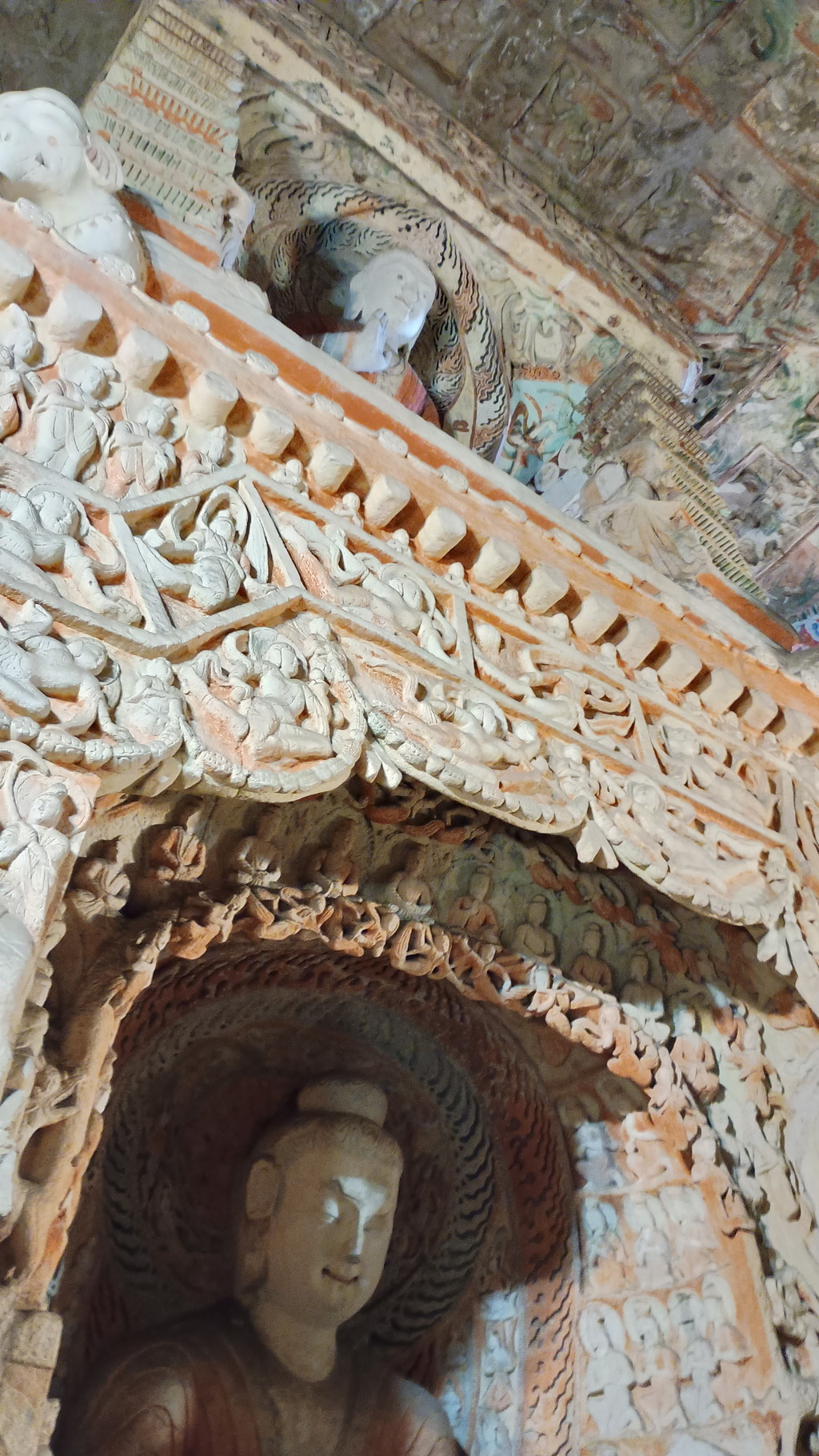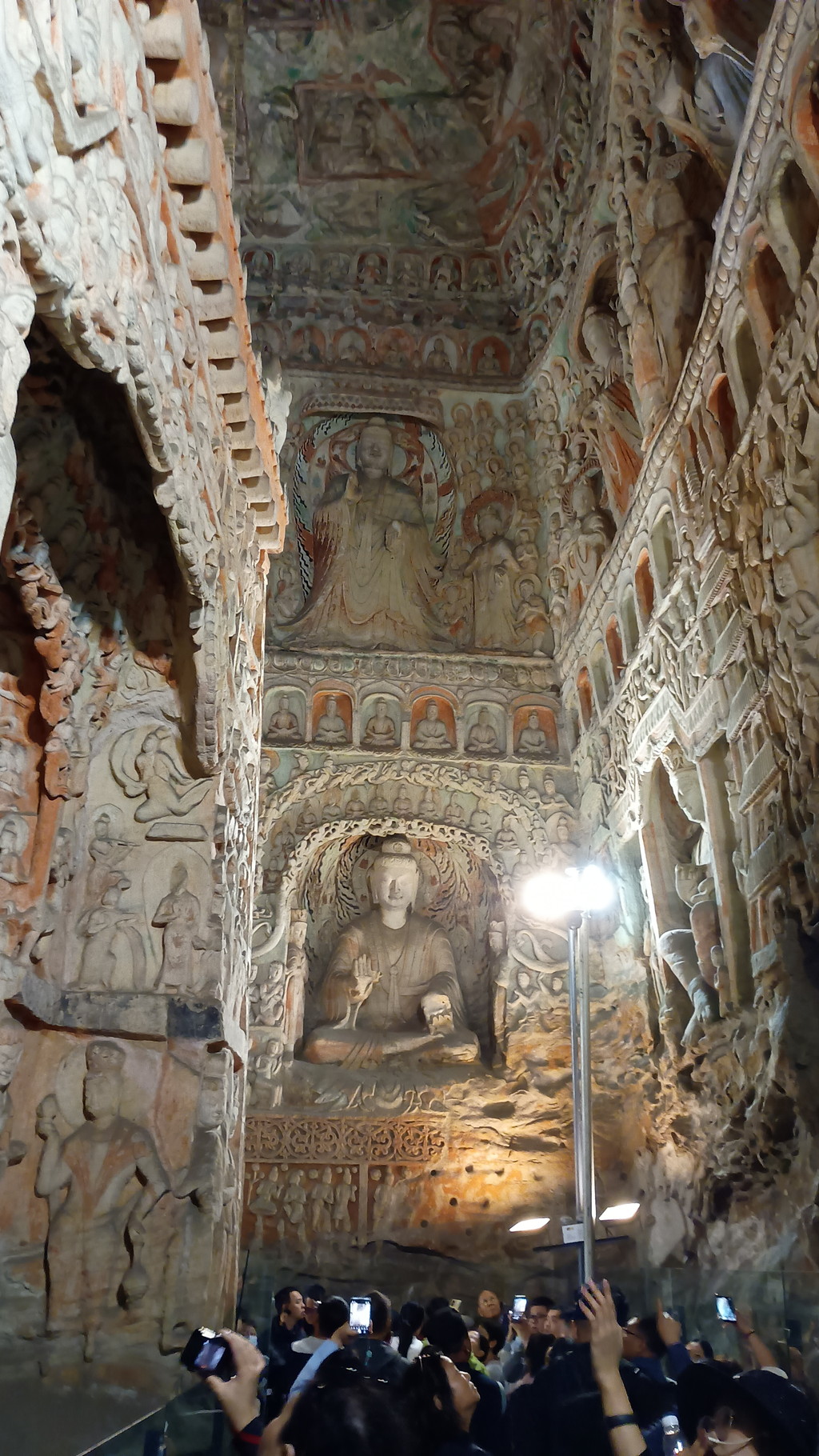 第5窟の中は非公開となっており、第6窟の方が公開されていました。主室はほぼ正方形で、中央には方形の塔柱があります。主室の4面、塔柱には隙間なく精緻を極めた彫刻が施されており、圧巻の光景でした。他の石窟に比べても、質量共にこの石窟は頭1つ抜けており、北魏が絶頂期だった時期に、このような素晴らしい石窟が建立されたのは決して偶然ではなく、国そのものの溢れんばかりの活力が仏教芸術に注ぎ込まれた結果なのだと感じました。