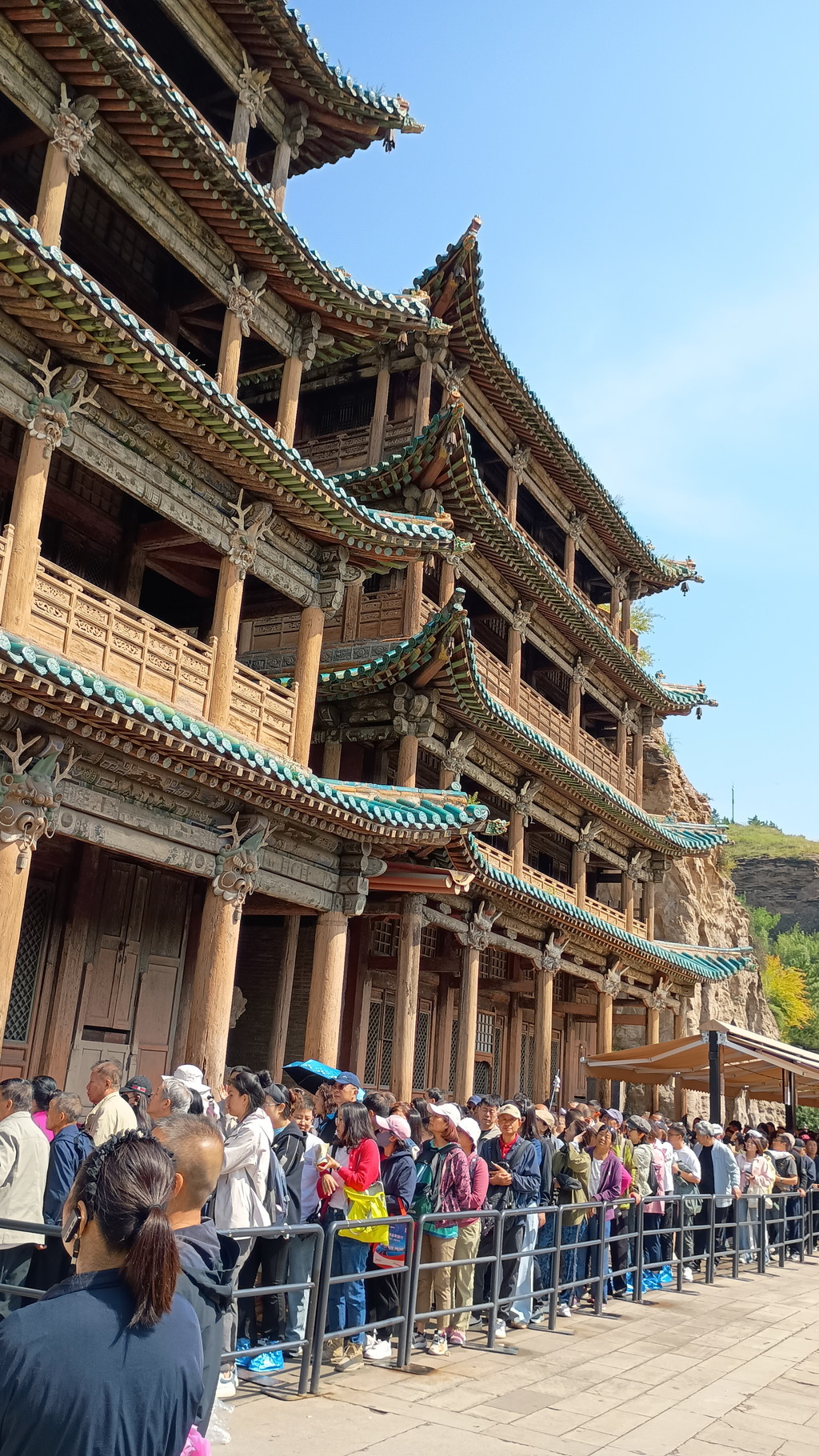 一通り見てから外に出ましたが、行列はさらに長くなっていました。石窟の中ばかりが注目されますが、正面の木造楼閣も風情があって見ごたえがありました。