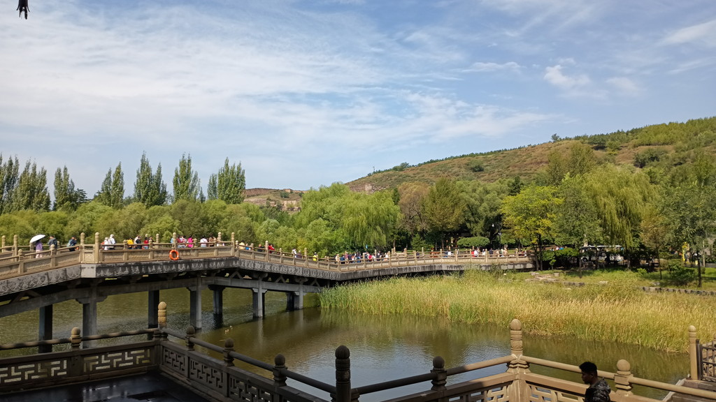 次に見えてくるは美しいアーチ橋(九峰橋)で、橋の先にあるのが湖の小島に建っている「霊厳寺(灵岩寺)」です。雲崗石窟は、元は霊厳寺(灵岩寺)といい、石窟全体の総称となっていました。南北朝の時代は、北魏皇室の拝礼所として用いられ、仏教信仰の中心となっていました。現存する建物は、明清時代に再建されたものです。寺院は3つの院(中庭)からなり、「山門」のほかに、中央に「千仏殿(千佛殿)」、奥に「大雄宝殿」があります。