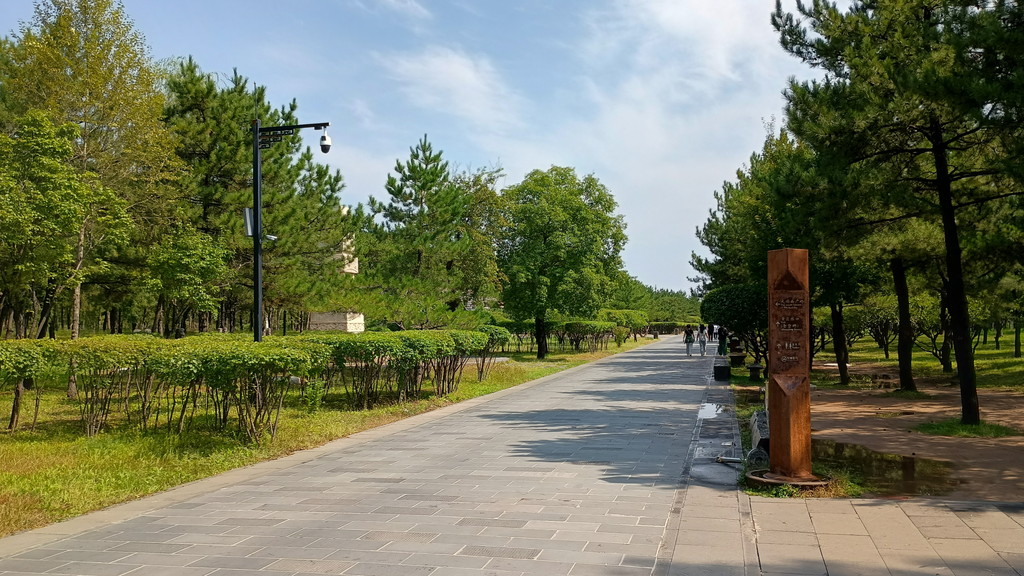 帰りは、来たときとは別の遊歩道を使って戻りました。第20窟前の「蓮花大道」を南にしばらく歩くと、電動カート乗り場がありました。ここでも電動カートは使わず、周りの景観を見ながらひたすら東に向かって歩きました。石窟のある崖の南側は大きな公園として整備されており、その広大さを体で実感しました。