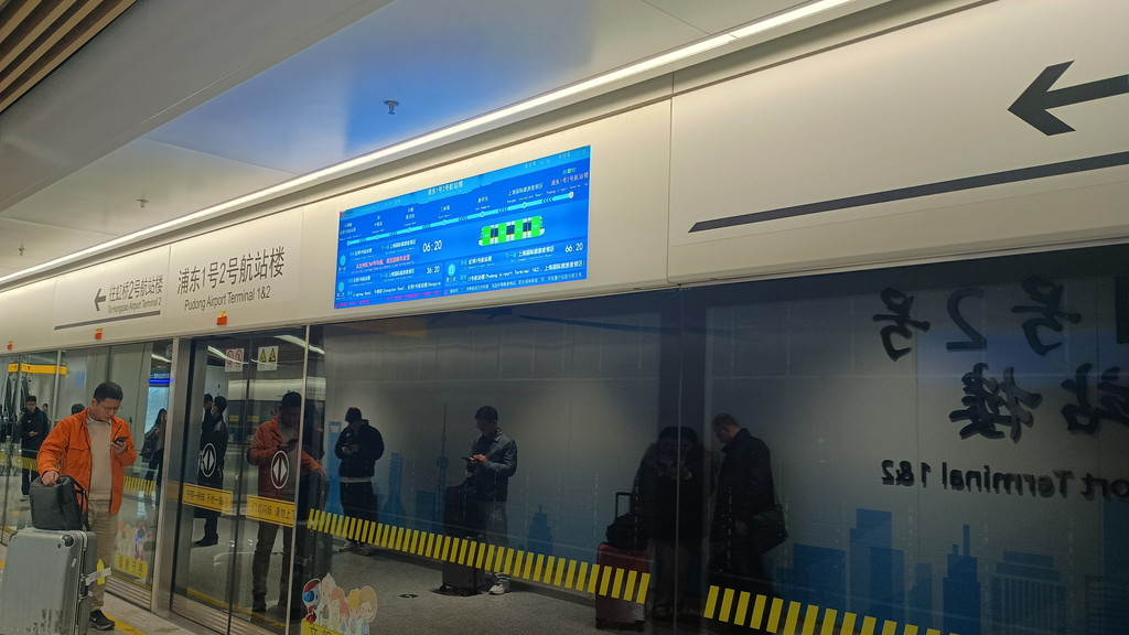 中国で高速鉄道や地下鉄を利用する際は、改札の前で荷物検査があるのですが、こちらでもありました。その後、改札ではQRコードを読み取り部にかざすと通ることができます。そこから階段を降りるとプラットフォームに到着です。プラットフォームは地下鉄駅と似たような作りになっています。上部のディスプレイにはあと何分何秒後に出発するとか、ここにはどの車両が停車するか、車両ごとの混雑具合などの情報が表示されており、さすが最近出来たばかりの鉄道だけあって、ハイテク技術が遺憾なく使われています。