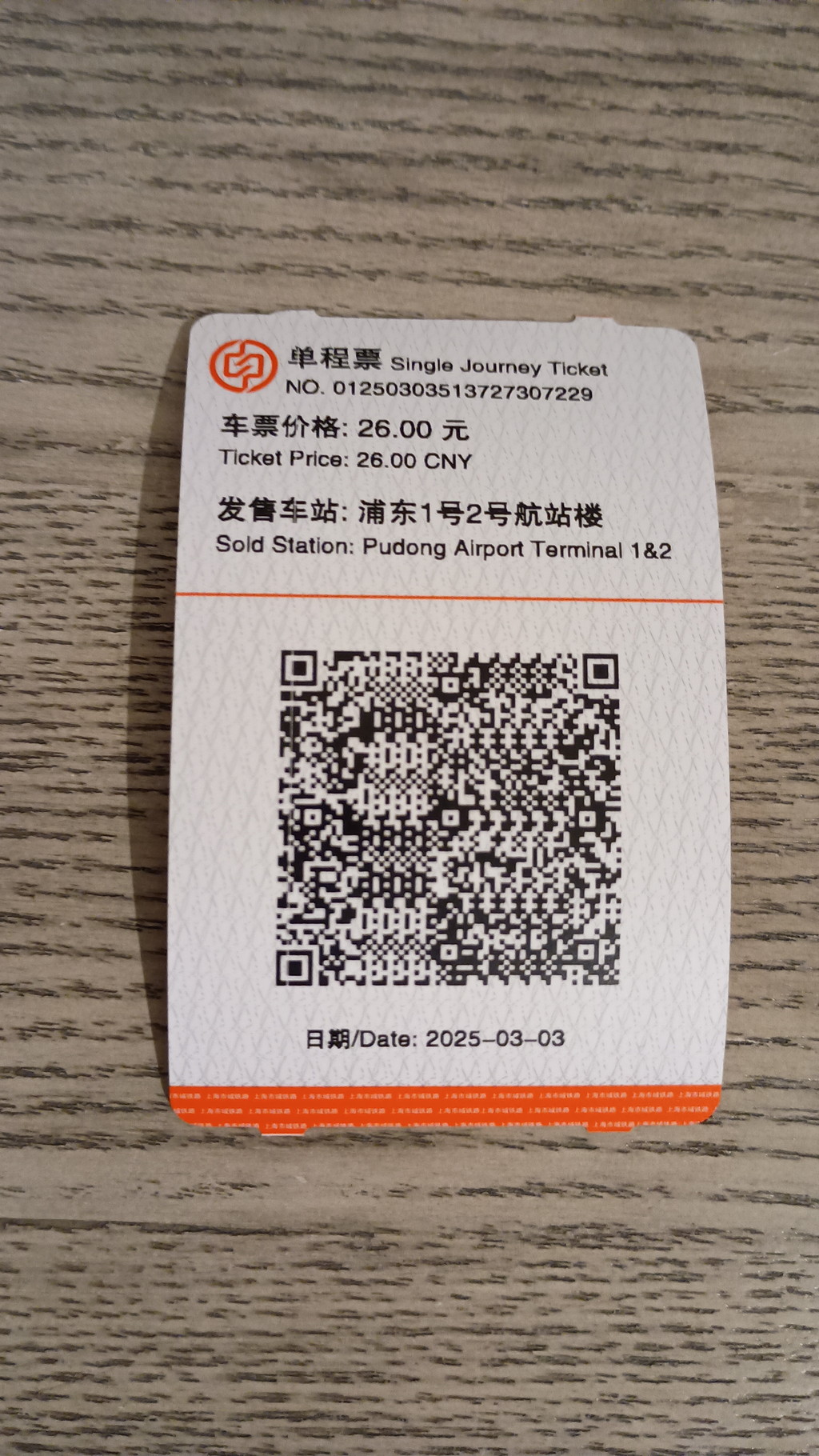 エレベーターで下に降りると、殺風景で広大なフロアに出るのですが、その中にポツンと連絡線の改札があり、隅の方に乗車券の券売機が置かれているのみです。今後、何かしらの拡張の余地を残しているのかもしれません。アリペイのミニプログラムを利用すれば地下鉄のようにQRコードで乗車できるのは知っていたのですが、今日はトラブルで時間を食うのが嫌だったため、シンプルに乗車券を購入することにしました。これはこれで問題があって、できたばかりの場所だったこともあるのか、通信状況が悪く、アリペイの決済がなかなか通らず手間取りました。今回使ったチョコSIMは、この券売機周辺だけが通信状況が悪く、あとは全く問題なく使えました。券売機は現金でも決済できたので、こういうときのために現金を持ってくる必要があることを身をもって体験しました。結局、何度かトライしたところアリペイの決済で購入できました。私があまりにも手間取っていたので、近くにいたスタッフと思われる男性が寄ってきてサポートしてくれそうな気配を出していました。ここは多くの外国人観光客が利用しているので、必然的に多くの問題が発生するでしょうから、常時スタッフが待機しているのだと見受けられます。決済が完了すると、QRコードが記載された薄っぺらの乗車券が発券されます。料金は25元(約550円)です。