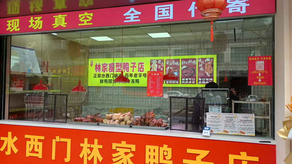 南京博物院から出ると13時半を過ぎており、まだお昼をとっていなかったこともあって、少しお腹が空いてきました。博物院からの帰り道、近くにあった屋台を眺めても食指を動かされるものがなかったので、ひとまずホテルに戻ることにしました。わざわざお店に入るのもめんどくさいなぁと考えていたのですが、そう言えば通りを挟んでホテルの向かいにある「林家瘦型鸭子店」というお店があったのを思い出したので、こちらで南京ダックを調達することにしました。南京市内にはアヒルを扱ったお店が多く、こちらも何店舗かを構えるチェーン店のようです。