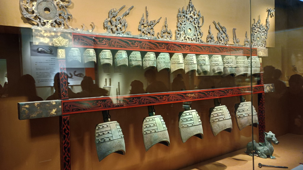編鐘と呼ばれる楽器ですが、残念ながら複製と書いてあった記憶があります。
