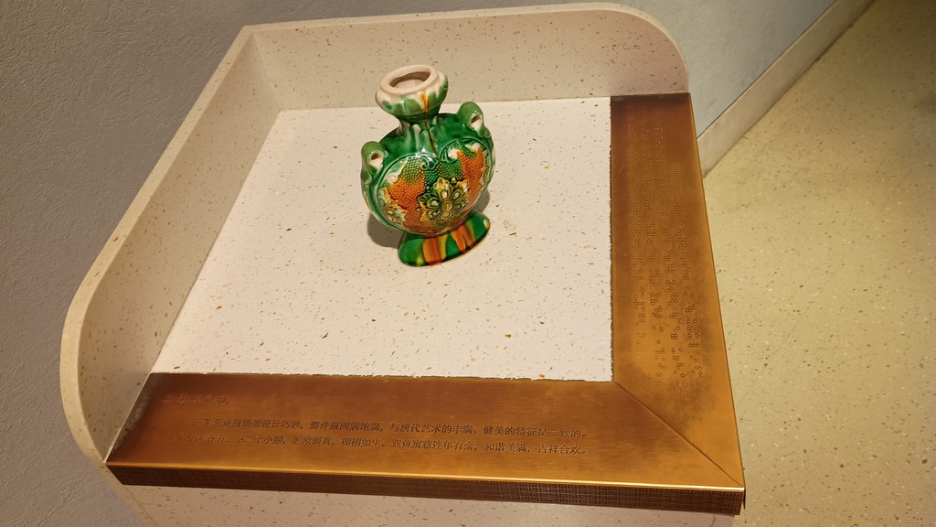 こちらの唐三彩は江蘇省揚州市の遺跡から出土したもので、中原地域の三彩陶器とは大きく特徴が異なるようです。二匹の魚をお腹合わせでくっつけた面白い形状をしています。