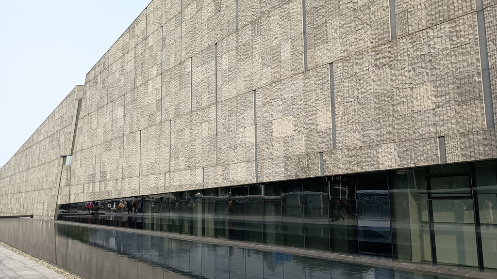 彫刻広場の先は記念広場となっており、こちらでは年に一度、国家による追悼式が執り行われています。整然とした広い空間には、いくつかの石碑が置かれており、中央には中国国旗が掲げられていました。厳粛な雰囲気の中、広場を逆くの字に横切って展示ホールの入口に進みます。