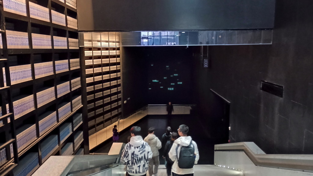 展示ホールに入った後は、地下に続く階段を下ります。階段の左側の棚には南京事件に関する膨大な資料が収められています。