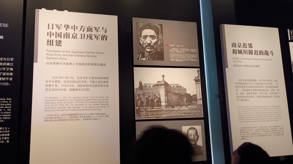 中央の顔写真は、南京防衛軍の最高司令官であった「唐生智」です。中央の下に写っているのは、日本軍の上海派遣軍司令官だった松井石根です。両名共、日本の教科書にもしばしば登場する人物です。