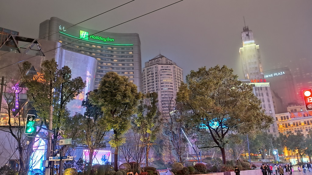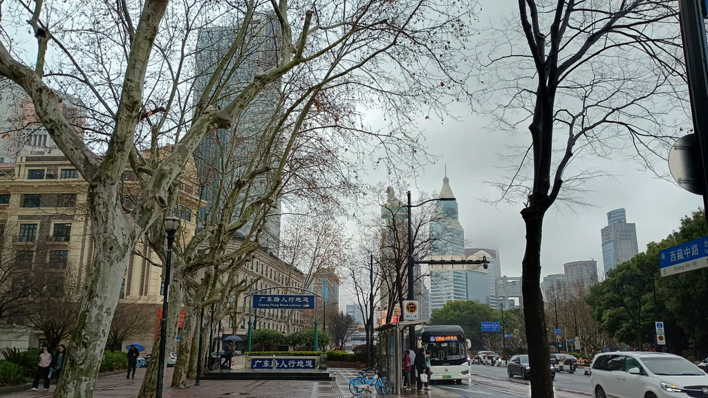 事前に調べた通り、人民広場駅は広大で、うっかり出口を間違うと、大通りを渡る必要があったりと、相当な遠回りをする必要になるのが分かりました。1km近く歩いて、15番出口から地上に上がると、「西藏中路」という大通りに出ました。雨は小雨となっていましたが、気温は低く肌寒さを感じます。大通りには高層ビルが立ち並び、大都会の上海に来たことを実感します。上空は厚い雲に覆われており、ビルの上層部が見えません。
