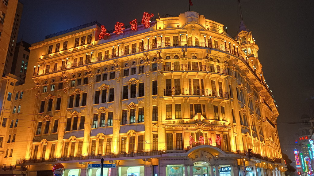 豫園への移動は地下鉄の14号線を利用します。人民広場から来た道を戻り、横断歩道橋を使って南側に渡ろうとしたところ、途中でレトロ感のある建物が目に入りました。「大世界」という字面もインパクトがあります。この時は、写真だけ撮影して地下鉄駅の方に向かってしまったのですが、後から調べたところ、なかなか面白い建物であることが分かりました。