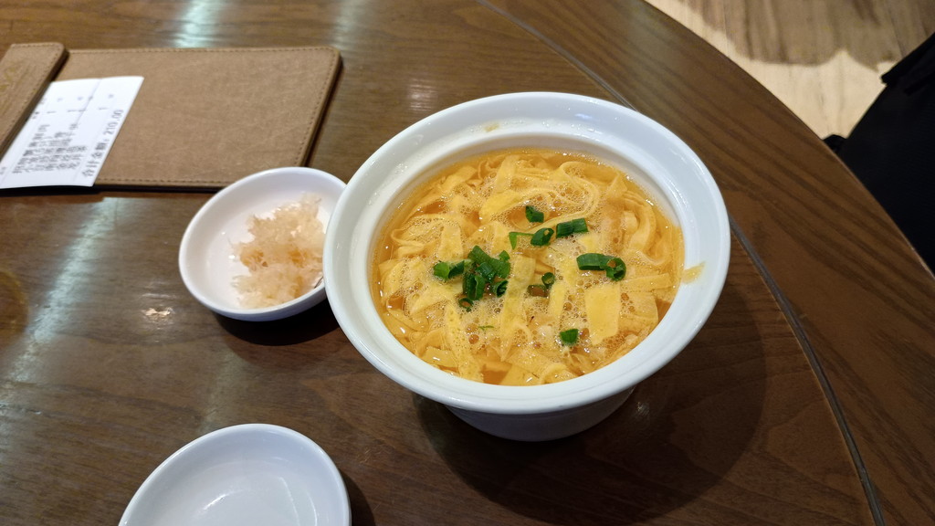 決済が完了すると、スタッフが注文票を持ってきて、小籠包は15分ぐらい時間がかかると説明がありました。間もなくすると、龍井茶がポットに入って運ばれてきました。小説家の司馬遼太郎さんの「街道を行く 中国・江南のみち」で読んで知ったのですが、龍井茶にはピンからキリまであり、茶畑の場所、葉っぱを摘み取る時期により相当な差が出ると解説されていました。要は、外国から旅行に来たド素人が本当に良いお茶を探し当てるのは難しいという話で、無駄金を使うのも嫌だったので、杭州でも無理して龍井茶を購入するようなことは控えていました。メニューには一応一級と書いてありましたが、おそらく一級の中にも大きな差があるんだと思います。ただ、一回ぐらいは飲んでみても良いだろうとは思っていたので、良い機会だったので頼んでみました。早速、頂いて見ましたが、とにかくスッキリとした飲み口が印象に残っています。ほんのりとして甘みもあり、日本でも美味しいとされるお茶を飲んだことはありますが、あれらとはまた違う上品な飲み物になっていました。
