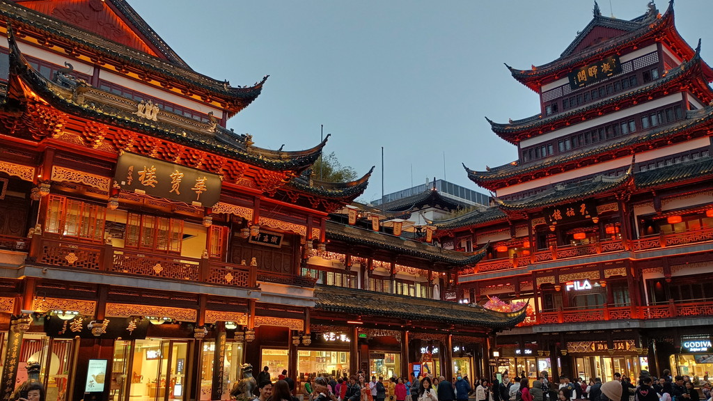 お腹も満たされましたので、お店を出た後は豫園商城を散策しました。辺りは大分暗くなってきたので、明かりが灯った建物の景観が一層映えてきました。
