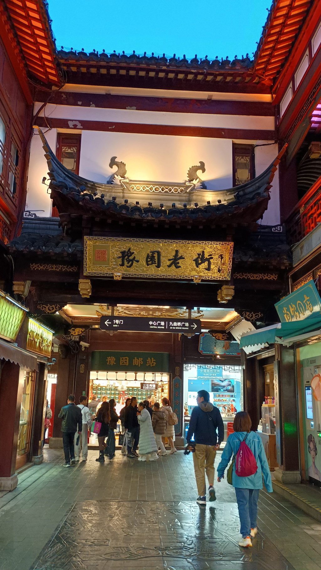 豫園駅の7番出口から地上に上がると、豫園商城の北側にある交差点近くに出ます。「豫园旅游商城」と書かれた牌楼がすぐ見えました。その先からは歩行者天国となっており、観光客の姿も見えてきました。