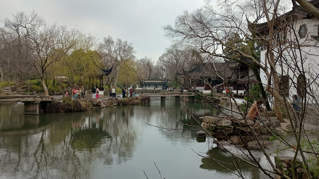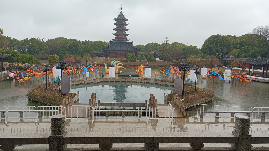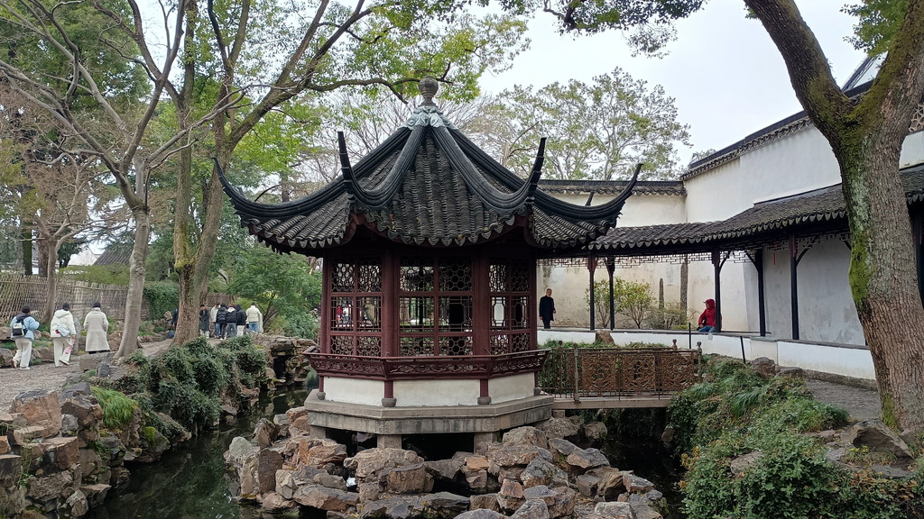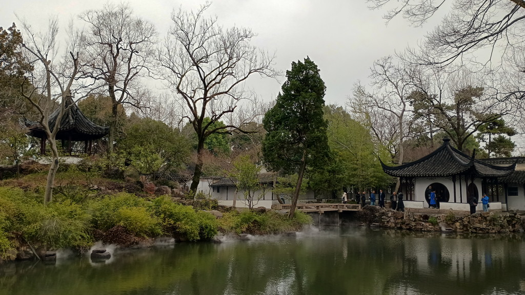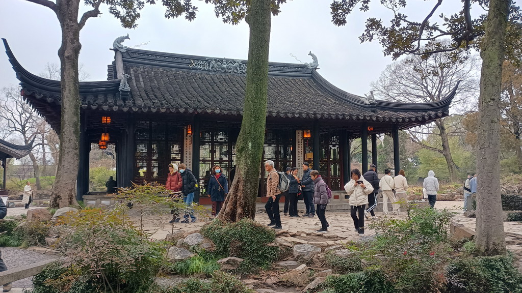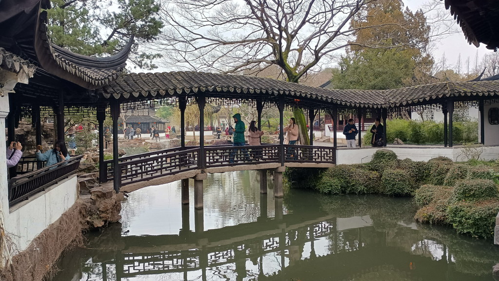 伝統的な庭園が何たるかは全く分かっていませんが、中国歴史ドラマで見たことがあるような建物や曲がりくねった回廊が中央を池を取り囲むように配置されています。この時は、雨も強くなって寒かったのですが、そのおかげか観光客の数も少なく静かな雰囲気の中散策することができました。この後に観光した拙政園などに比べると認知度が低いのか、あちらこちらで見かけた漢服を着た若い方々の姿もありません。