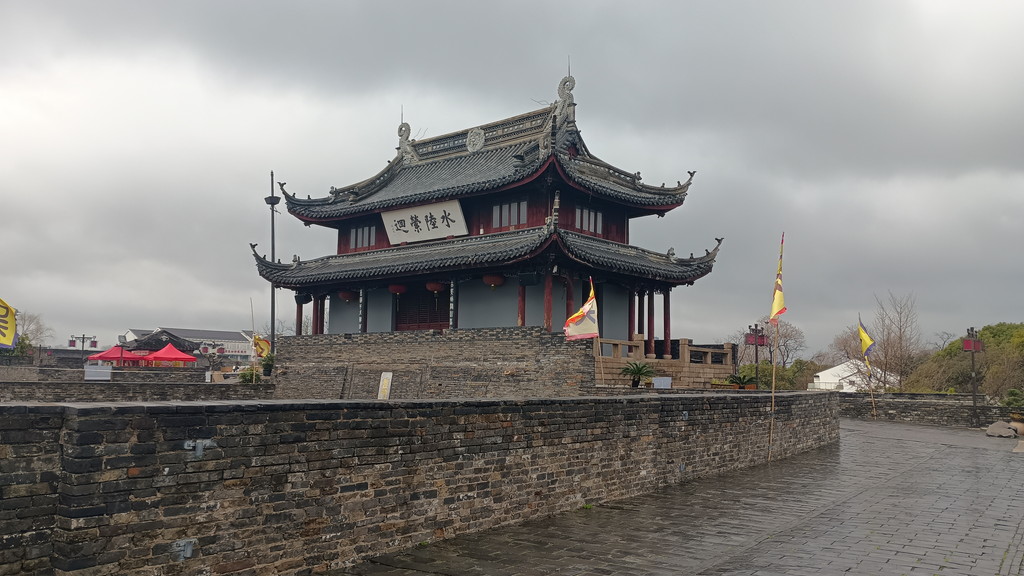 盤門をくぐって内側から見た景観です。内側は四方を城壁に囲まれており、侵入した敵を城壁の上から攻撃できるように作られています。日本の城郭でいうところの虎口と同じ役割でしょうか。また、門の反対側には入場ゲートが設けられており、南側から入場することも可能です。