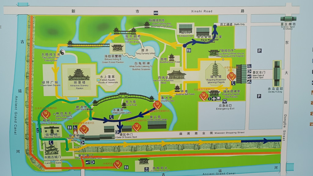 盤門景区は歴史にゆかりのある観光名所であり、個人的には蘇州で一番行きたかった場所でもあるのですが、世間一般には知名度がイマイチのようで、山塘街や拙政園などに比べると明らかに観光客の数が少ないようでした。この後は、来た道を戻って一旦ホテルに戻りました。