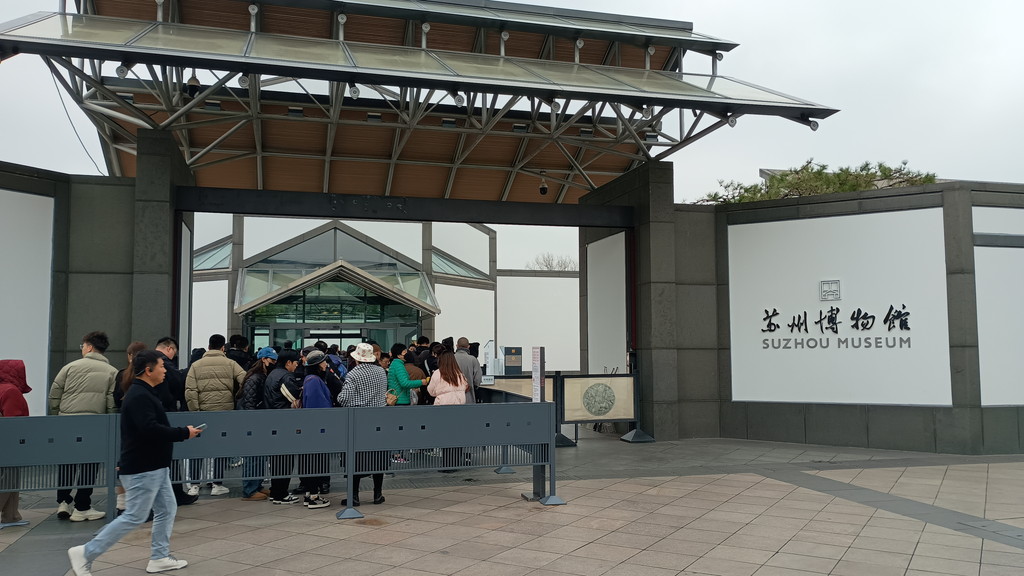 地下鉄駅から上がって外に出て、目の前の交差点を渡るといかにも観光地だと分かる通りがあり、観光案内所などの建物も見えてきました。少し歩くと、行列が出来ている場所があったので、ここが拙政園だと思ったのですが、蘇州博物館でした。そう言えば、この博物館は拙政園のすぐ近くにあったのでした。蘇州博物館は大変見ごたえのある博物館として評判で、入場料も無料のため事前の予約が必須とされています。