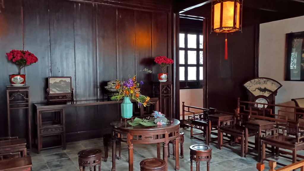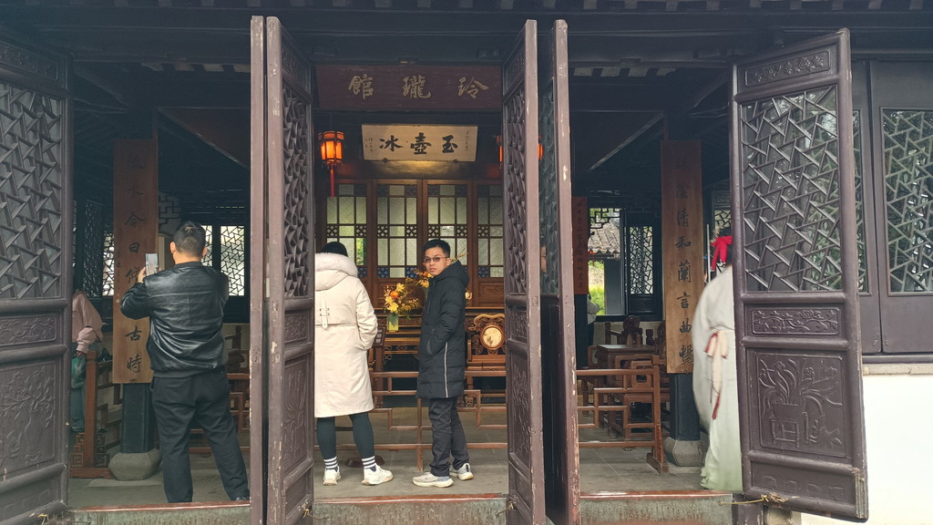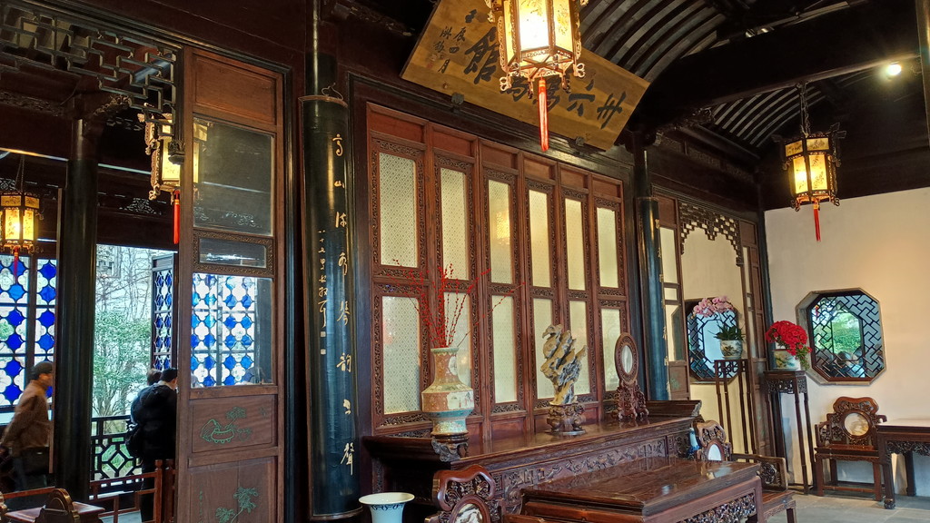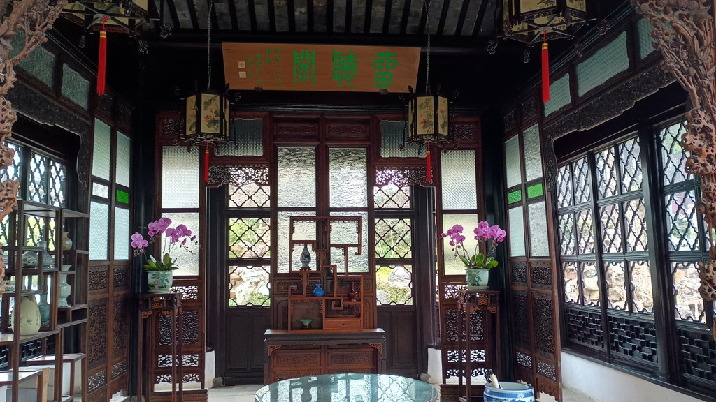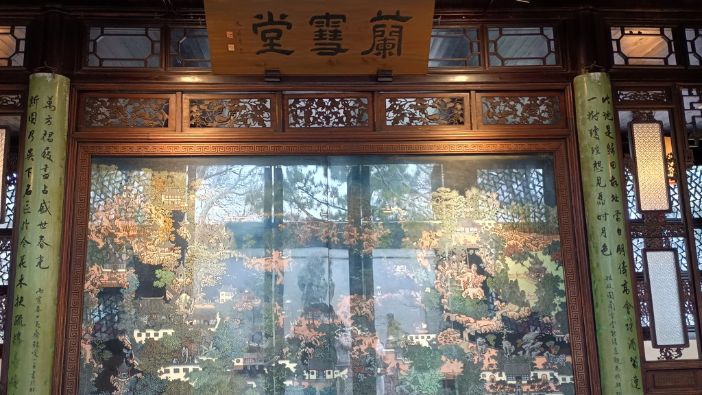 入口を抜けてすぐのところに蘭雪堂があります。蘭雪堂の名前は、李白の詩の一句から取られているそうです。光が反射して上手く写真が撮れなかったのですが、中には彫刻と言ってもいいのでしょうか?拙政園の全体図にもなっている見事な作品が展示されていました。
