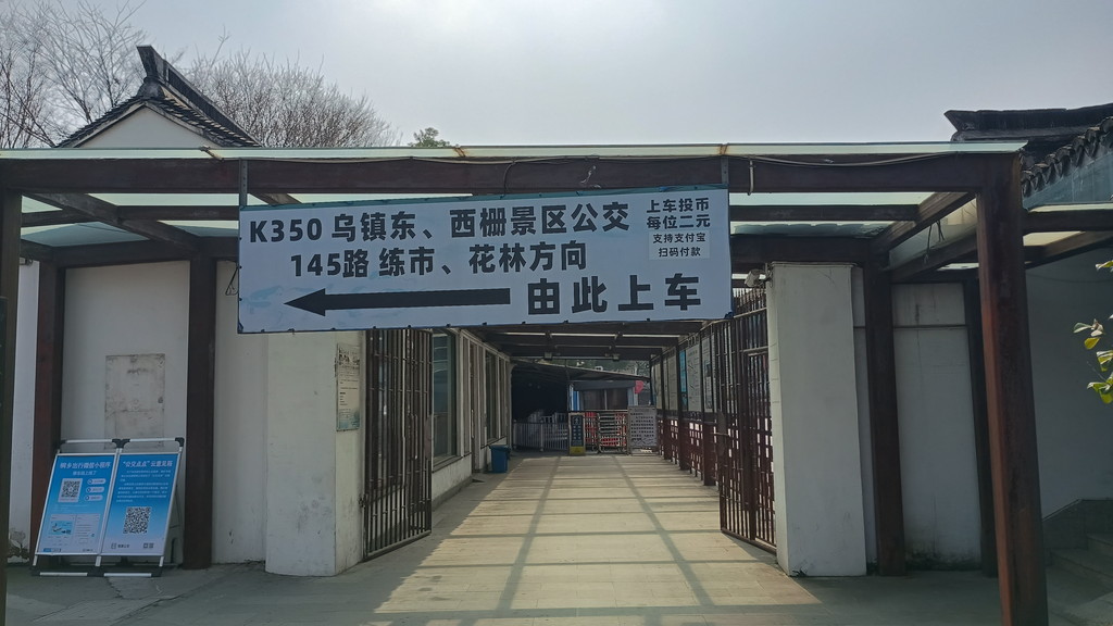 今回事前に分からなかった鳥鎮行きバスの利用方法(決済手段)ですが、待合室に案内があったのであっさり解決しました。アリペイから桐郷市の交通カード「桐乡公交一卡通」のミニプログラムをダウンロードすることで、QR決済での乗車が可能となります。ちなみに、こちらのミニプログラムを検索する場合は、「桐郷市」ではなく「嘉興市」で検索すると見つかります。中国の自治体の構造が良く分からないのですが、鳥鎮は桐郷市に属しており、さらに桐郷市は嘉興市に属していることによります。桐郷市と検索してもヒットしません。