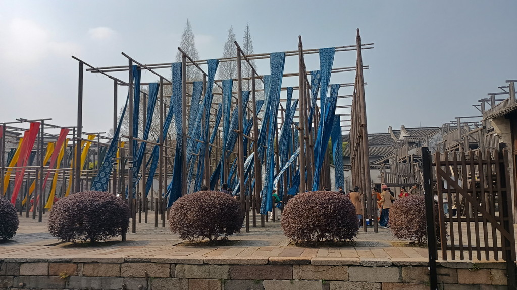 絹の産地として有名な鳥鎮には、いくつもの染色工房がありました。この花柄の藍染は「藍印花布」といって、中国の伝統的な工芸品であり、地元で採れた草木などの天然染色を使っているそうです。この技術は、漢代に始まり宋、元代に発展し明、清代には繁栄を謳歌したようです。
