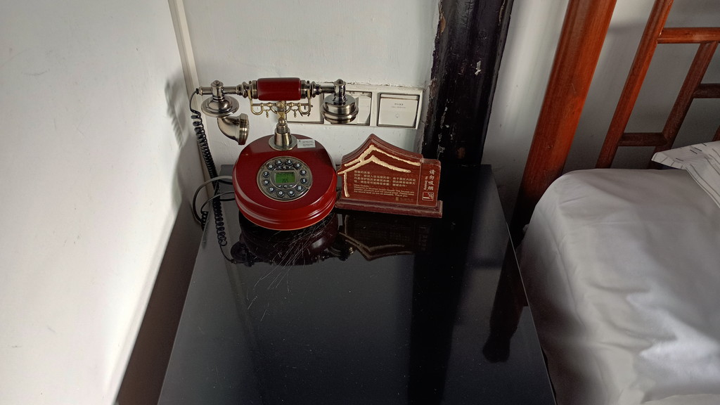 設備面ですが、冷蔵庫は無く、湯沸かしポットがありました。木製の机や、電話などは、部屋にマッチするように工夫が凝らされています。テレビは設置されていましたが、電源が入らず使い方も良く分かりませんでいた。Wi-Fiを使うためには、中国の電話番号によりSNS認証する必要がありました。アメニティは地元で作られた木製の櫛などが提供されていました。