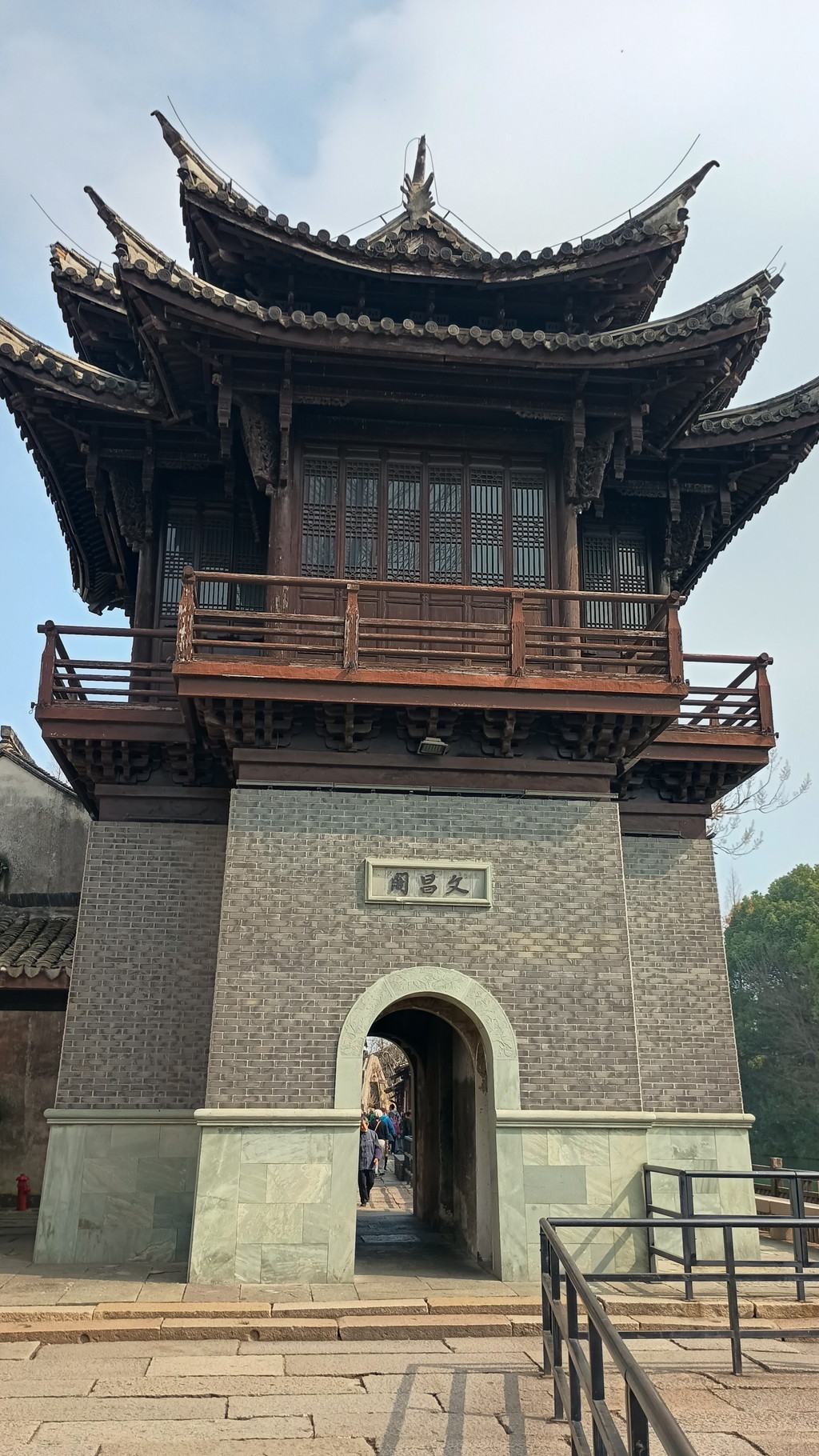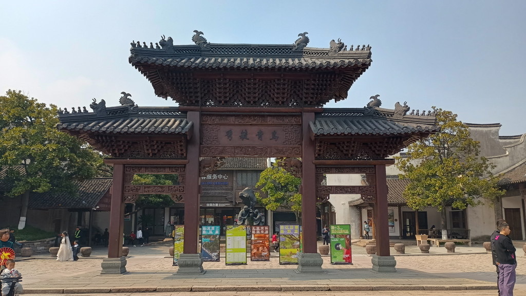 バスターミナルの目の前には、鳥鎮西柵景区の入口となる「鳥青玉秀」と刻まれた牌坊がありました。鳥鎮は、元々鳥鎮と青鎮の二つの鎮に分かれていたのが、1950年に合併して鳥鎮となった経緯があり、鳥青は鳥鎮を指す言葉となっています。玉秀は霊的で美しい景色であることを意味するようです。