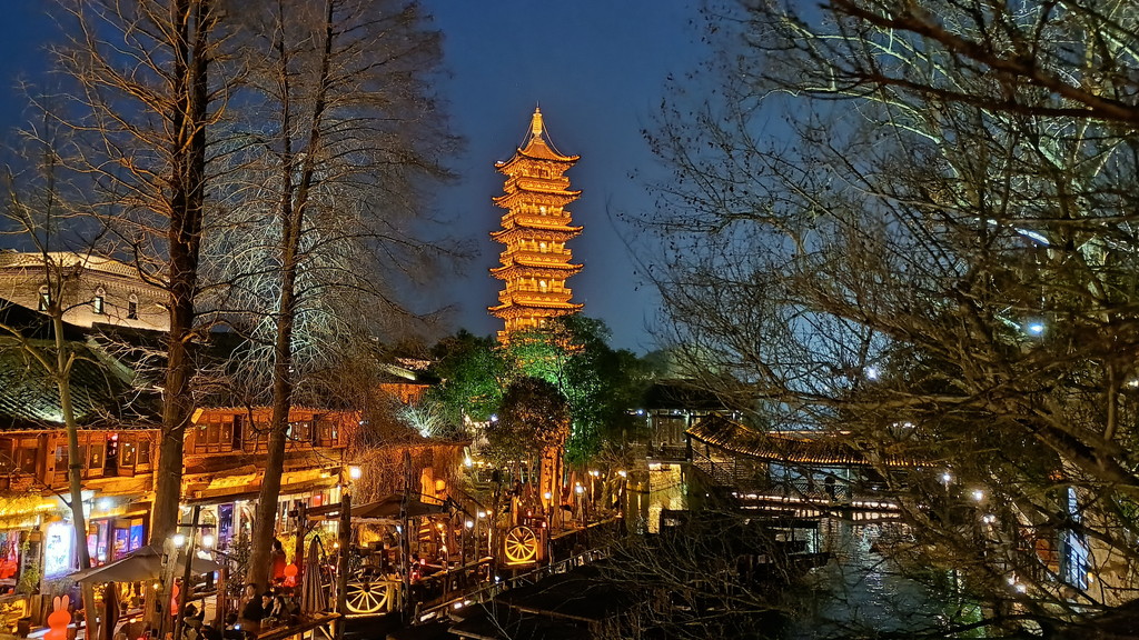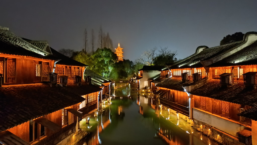 南塘橋からは、端の方に文昌閣が見える良い景観となっています。ライティング自体も、ド派手な感じではなく、暖色と緑の落ち着きのある組み合わせとなっていて、鳥鎮独自の工夫が見られました。