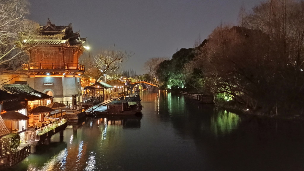 中国の観光名所は大体どこもライトアップに力を入れているので、若干食傷気味になっていたのですが、鳥鎮のライトアップはさすがに一味違いました。日中に景観の良かった場所は、夜になっても相変わらず良く、絶好撮影ポイントである通済橋には多くの観光客が集まっていました。