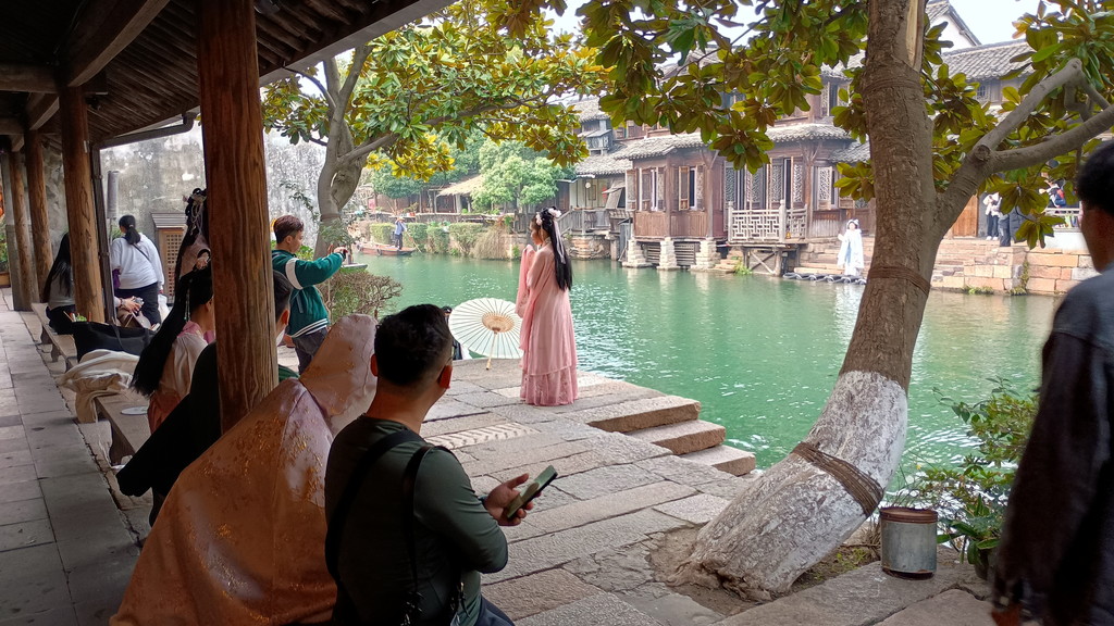中間地点付近に来ると、再び賑やかになってきました。「女紅街」という通りで、様々なお店が集まっています。ここからは西市河の対岸が良く見通せる場所にもなっています。今回利用させてもらった民宿もこの近くにあります。この辺りは、人気のある撮影スポットにもなっているようで、漢服を着ている若い女性の姿がありました。