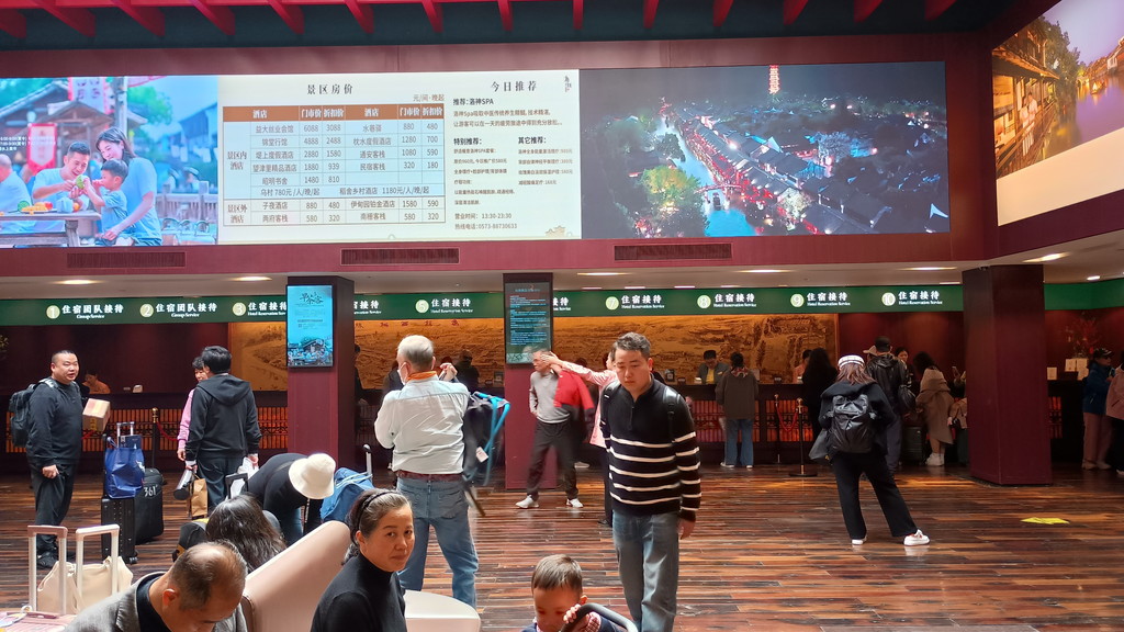 景区内の宿泊施設は、1泊数千円の民宿から数万円の高級ホテルまで様々なグレードがあり、チェックインはすべてこちらの窓口で行っています。お客さんもそこそこいましたが、スタッフの数も多く、待つことなく手続きに進めました。