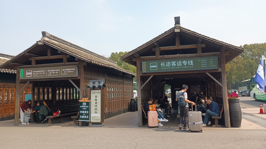 バスが停車した場所は、小規模ながらもバスターミナルとしての機能を持っているようで、待合スペースのほか、長距離バスのチケット売り場がありました。わざわざ鳥鎮バスターミナルを経由しなくても、ここから直接上海や杭州、蘇州行きの長距離バスに乗ることが可能です。杭州蕭山空港行きのバスもありました。なお、ここから東柵景区に行く手段として、今ほど利用したK350路のほかにも、無料のシャトルバスがあり、こちらの乗降地点にもなっています。