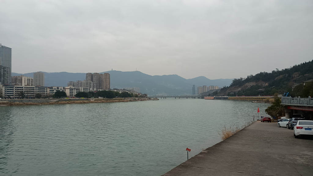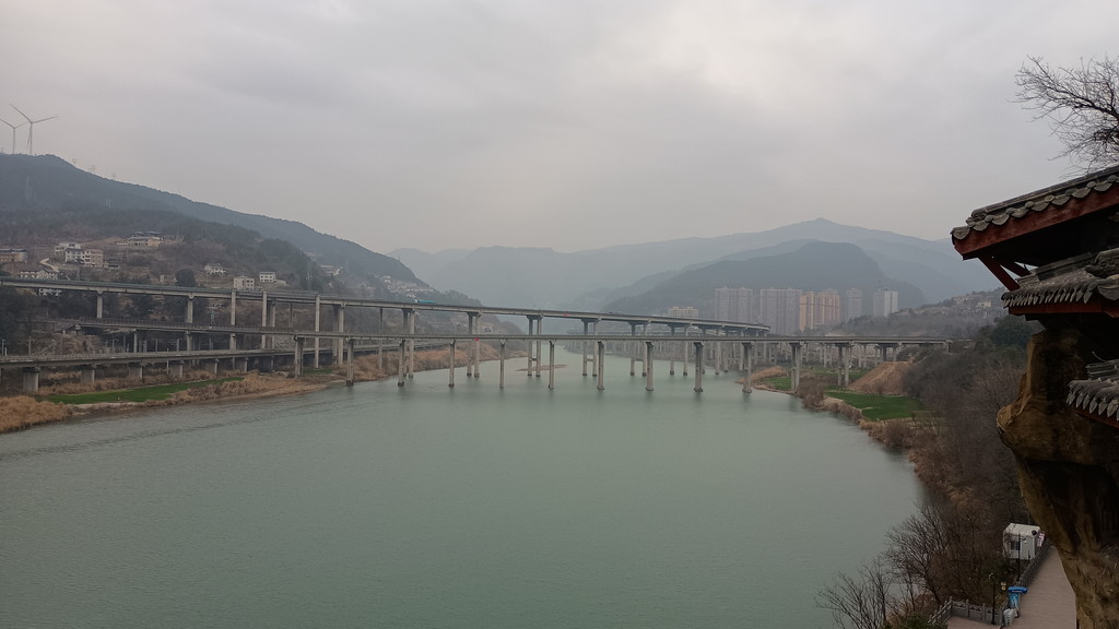 見通しの良い場所に出ると、高所から眺める嘉陵江の景観が素晴らしく、ついつい見入ってしまいました。山と川を背景にした、高架橋が交わる立体感とスケール感のある景観となっており、広元市ならではのものです。