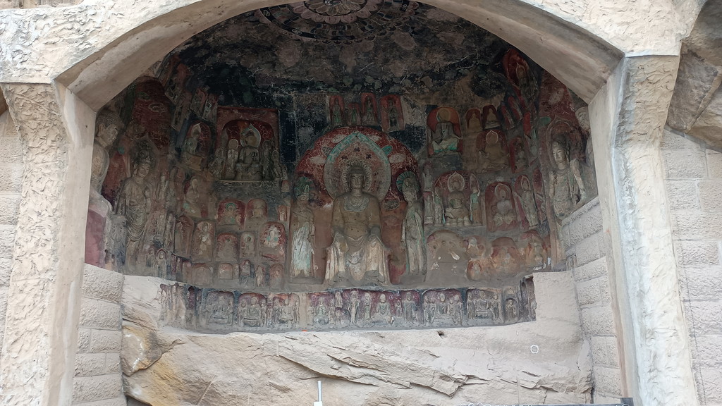 「千仏窟(千佛窟)」、彫刻の緻密さと鮮やかな色彩が印象に残っています。背面が屏風となっている窟であり、中央に一仏、2人の弟子、2人の菩薩、2人の天王、2人の力士の九尊像が彫られています。背面の屏風には菩提樹が、2つの樹の間には天竜八部のレリーフが施されおり、周囲の壁には千仏が彫られています。