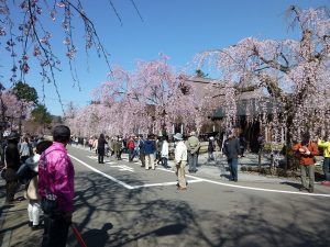 少し歩くと、伝承館という建物があり、この辺は桜が満開になっていました。大勢の観光客が桜を楽しんでいました。