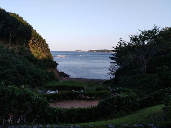 屋外テラスからの的矢湾の景色は美しく、歩いて磯辺に行くこともできます。